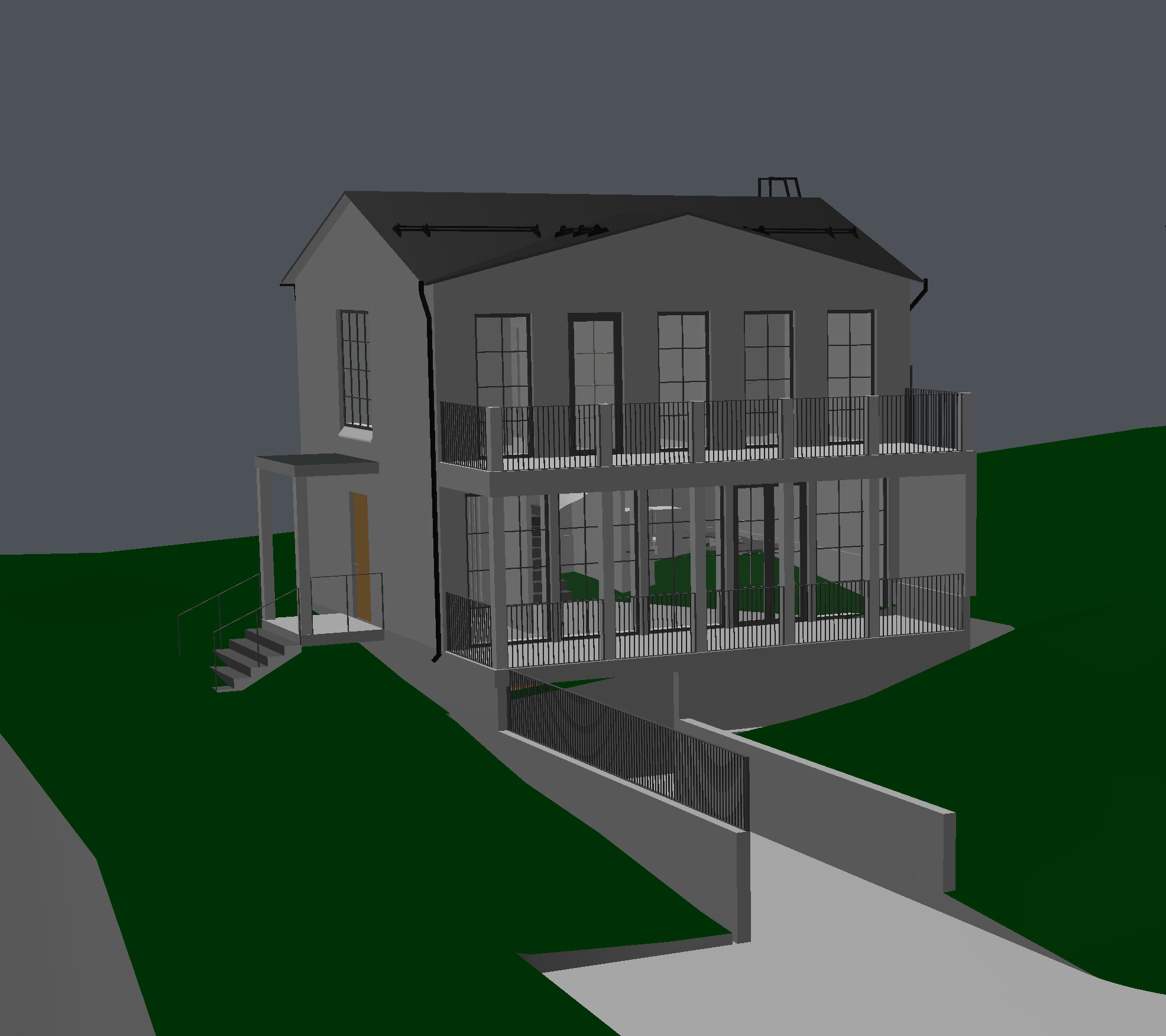 wooden facede vertical light grey color all the fences black metal roof black some green and colorfull bushes around the garden area road left side of the house vertical