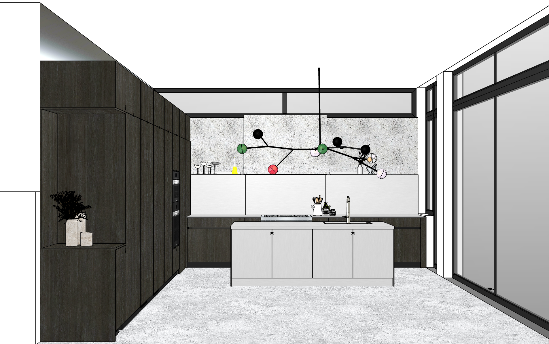 keep original finishes island is all stainless steel back wall countertop backsplash and shelves are stainless steel there s a mirror above the top cabinets attached to the wall