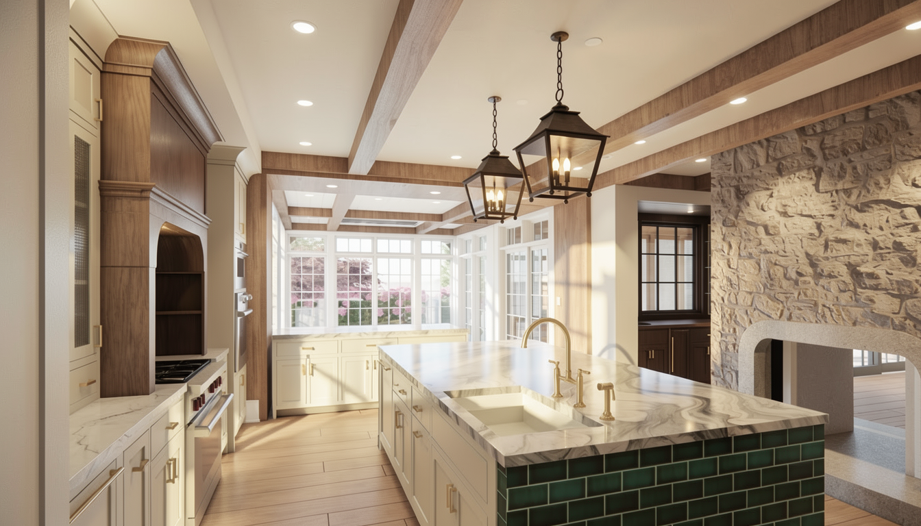 use the provided render as the base lock geometry lock camera lock all material positions no material may appear on any surface other than where explicitly assigned below lower upper cabinetry fronts only warm greige lacquer mid grey beige sophisticated not cold ultra matte soft touch on door and drawer fronts only tall full height panels only dark walnut deep warm brown bold grain matte oiled panels only do not bleed onto cabinet fronts or island range hood exterior only same warm greige lacquer as cabinetry fully integrated tonal match hood surface only island waterfall all countertops only cosentino clos ivora light elegant mineral surface subtle veining polished inlayr 3d depth on horizontal tops and island waterfall sides only do not apply stone to any vertical cabinet surface backsplash wall only full height clos ivora slab seamless from countertop to base of upper cabinets only continuous no grout lines do not extend to ceiling hardware brushed bronze on cabinet doors only ceiling bright greige warm light slightly tonal with cabinetry but much lighter do not drench ceiling dark floor keep existing floor do not change lighting bright cool warm balanced showroom daylight from across the kitchen crisp professional lifted ambient no shadows crushing detail tonal warm luxury kitchen ultra photorealistic showroom refined editorial interior architecture strength 75 seed 7338