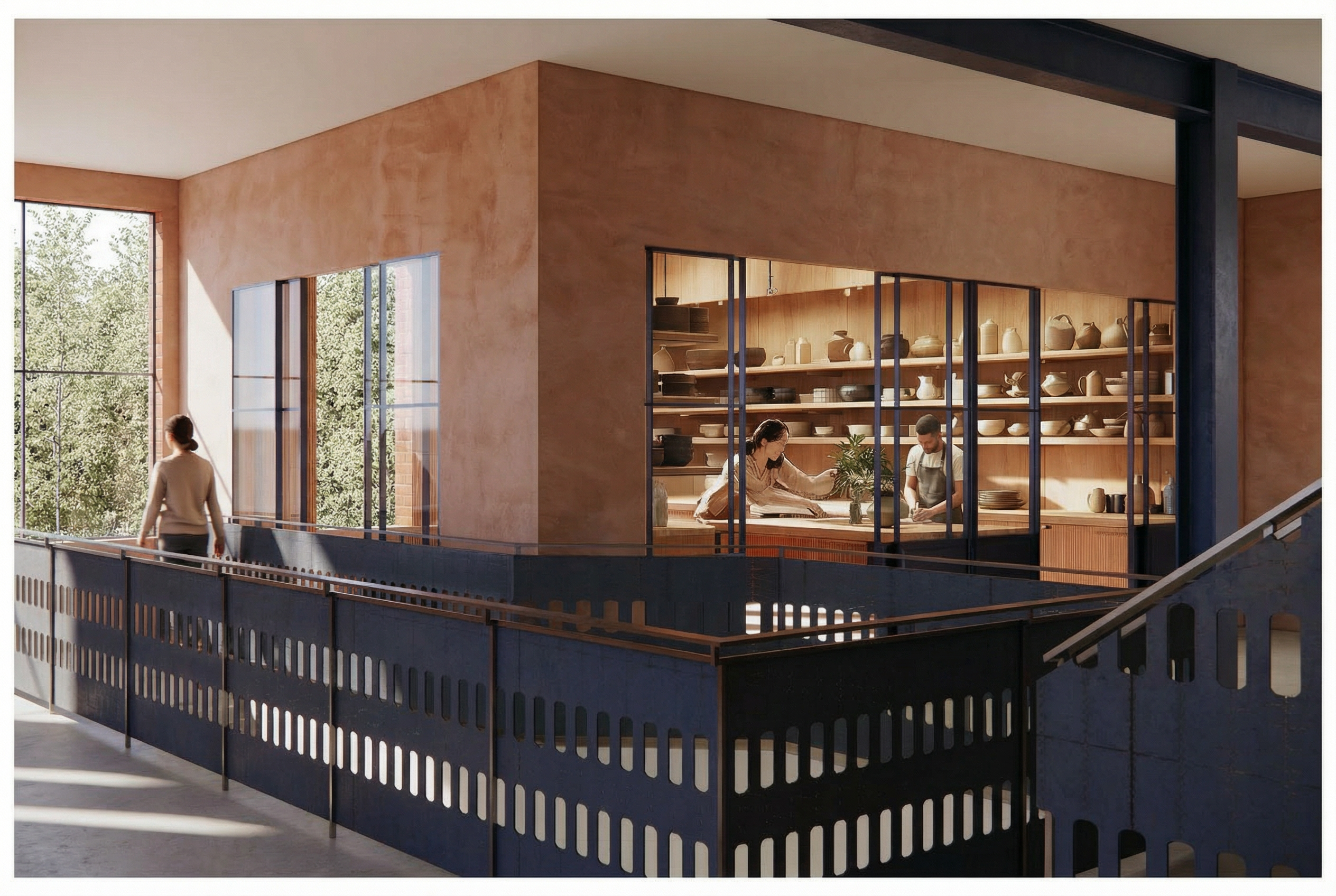 grainy watercolor render of craftsman styled home with red paint include trees and mountainous alaska environment in the background simple driveway and walkways in front of the home