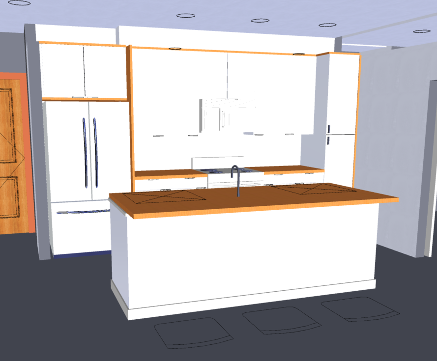 render this kitchen with light oak cabinets cabinet handles to be brass brass sink faucet quartz countertop with very slight grey vein quartz backsplash with very slight grey vein appliances to be ge caf model in matte white refrigerator handles to be brass range handle to be brass microwave handle to be brass flooring to light oak walls to be painted flat white base molding to be painted glossy white entry door to the right to be a flush panel door painted white