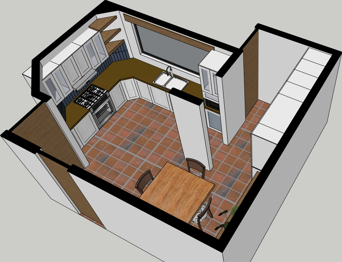 classic style kitchen white wood finishing some glass doors and clay tiles boho inspired interiorism axonometric view