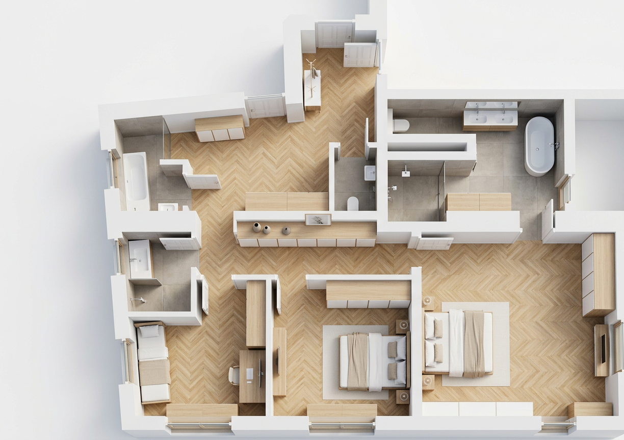 convert this floor plan into a realistic isometric 3d view of a full house show the space from an elevated angle with furniture walls and details visible skandinavischer stil fischgr t parkett m bel modern wei beige altbaut ren in wei m bel aus holz in eiche hintergrund immer wei links im oberen eck ist eine treppe das objekt an der wand rechts davon ist ein fensster keine t r use the same furniture as shows on the plan do not change the orientation of the floorplan