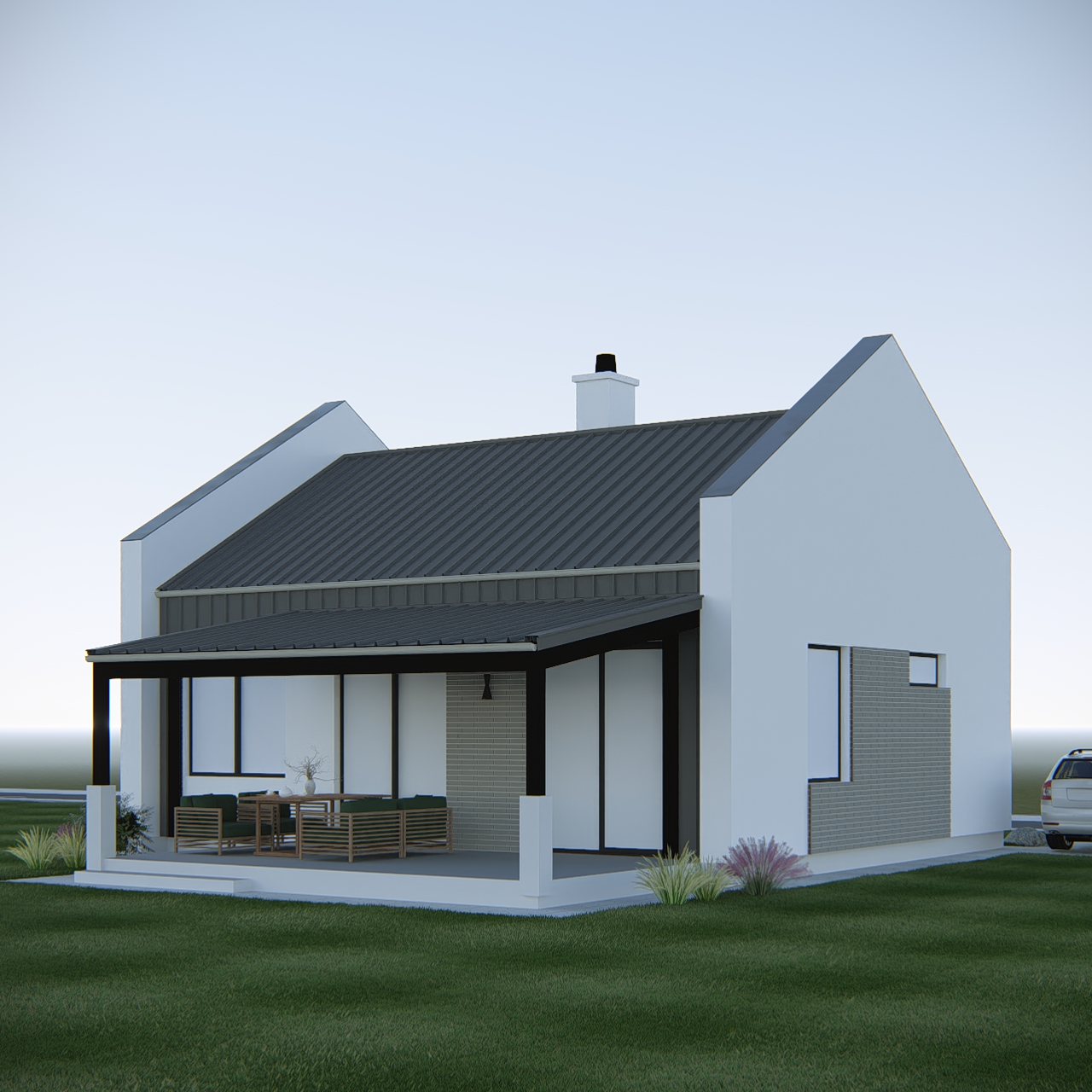 minimalism exterior shot use the uploaded building image model as the base reference important strict constraints strictly preserve the original building geometry roof shape number of floors window positions window sizes door positions and all proportions do not change the building s shape form or architectural elements no architectural modifications material replacement only no geometry change do not alter any proportions roof windows doors or facade elements ultra realistic architectural visualization of a modern private house exterior facade finished with smooth white decorative plaster roof made of anthracite metal roofing panels facade inserts finished with thin brick veneer panels the brick should look like flat decorative brick veneer with approximately 20 mm thickness smooth modern brick texture minimal relief important use brick veneer brick slips not traditional brick masonry placed on the end wall of the building and between the windows no deep brick masonry no traditional brick wall thin brick slips only windows glass windows with realistic reflections of the surrounding environment and sky inside the house slightly visible light transparent curtains facade lighting do not add any new facade lights use lighting only from the existing wall mounted exterior light fixture ground and landscape design house perimeter and pathways made of paving stones background softly blurred trees shallow depth of field weather and lighting half daylight half warm sunset light soft long shadows warm glow on the facade clear sky camera architectural photography eye level view 24 35mm lens render ultra realistic photorealistic high detail materials global illumination ray tracing 8k architectural render strict instructions for ai preserve geometry exactly do not modify any architectural proportions window sizes roof or doors apply only materials textures lighting and landscape improvements no changes to building form architecture