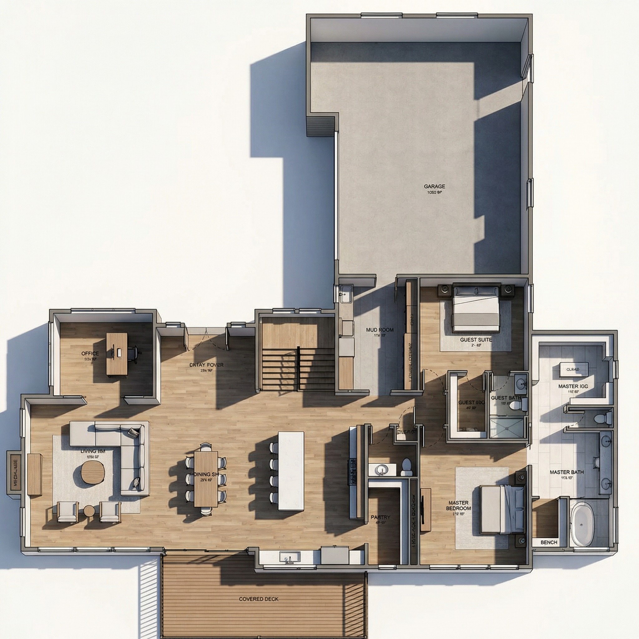 convert this floor plan into a modern isometric 3d view of a full house show the space from an elevated angle with furniture walls and details visible do it again remove islands in main room use the same furniture as shows on the plan do not change the orientation of the floorplan