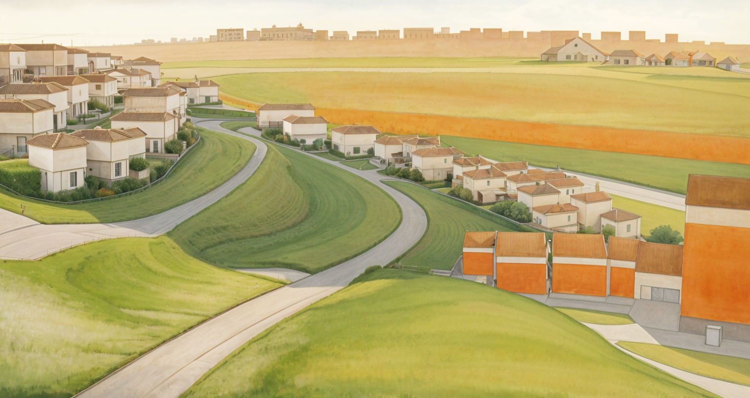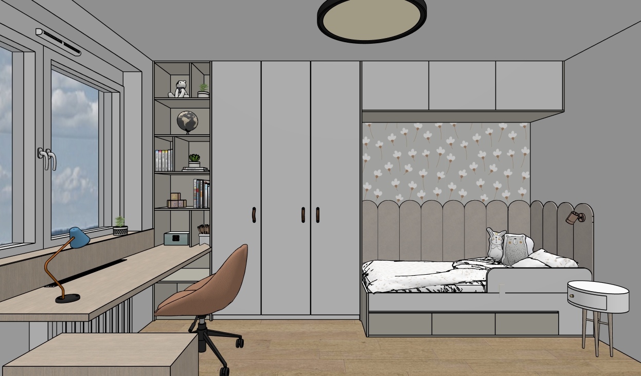 create a modern bedroom with a clean and minimalist design the room features a large window with a view of a bright blue sky and fluffy white clouds letting in natural light the walls are painted in a soft calming gray the main elements include a built in wardrobe and shelving unit painted in light gray with simple metal handles a cozy bed with a scalloped beige headboard sits against a wall with delicate floral wallpaper in muted colors adding a touch of elegance there is a wooden floor in light oak enhancing the warm atmosphere a sleek desk and a modern chair in a rich caramel color sit by the window complemented by a stylish blue desk lamp the overall atmosphere is serene and inviting with a focus on functionality and aesthetic simplicity