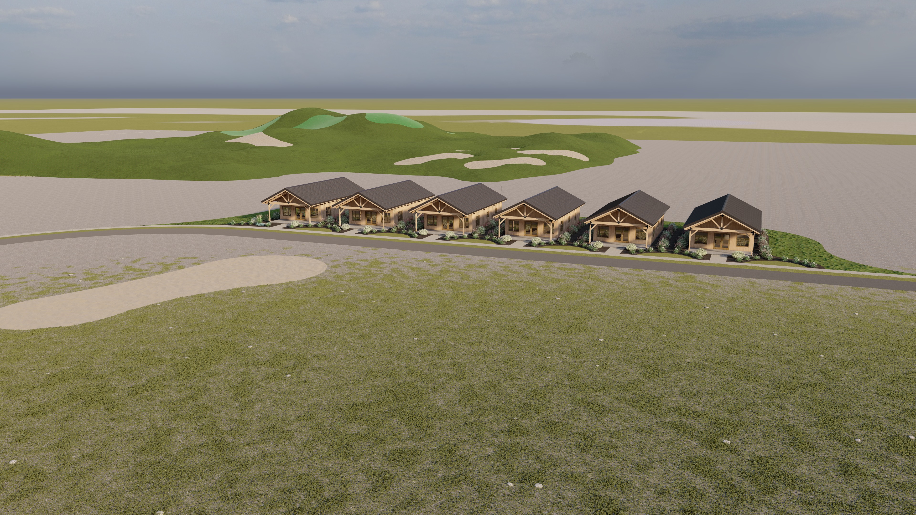create a photorealistic 3d perspective of this set of houses use the current style of materials as a reference keep the model s geometry unchanged windows doors roof walls porch pavement and entrance add a golf course environment with lush vegetation do not change the viewpoint only improve the existing materials and enhance the landscape include detailed vegetation realistic textures on the wood siding reflections in the glass and a vibrant clear sky with atmospheric depth render with hyperrealistic architectural visualization quality at 8k resolution