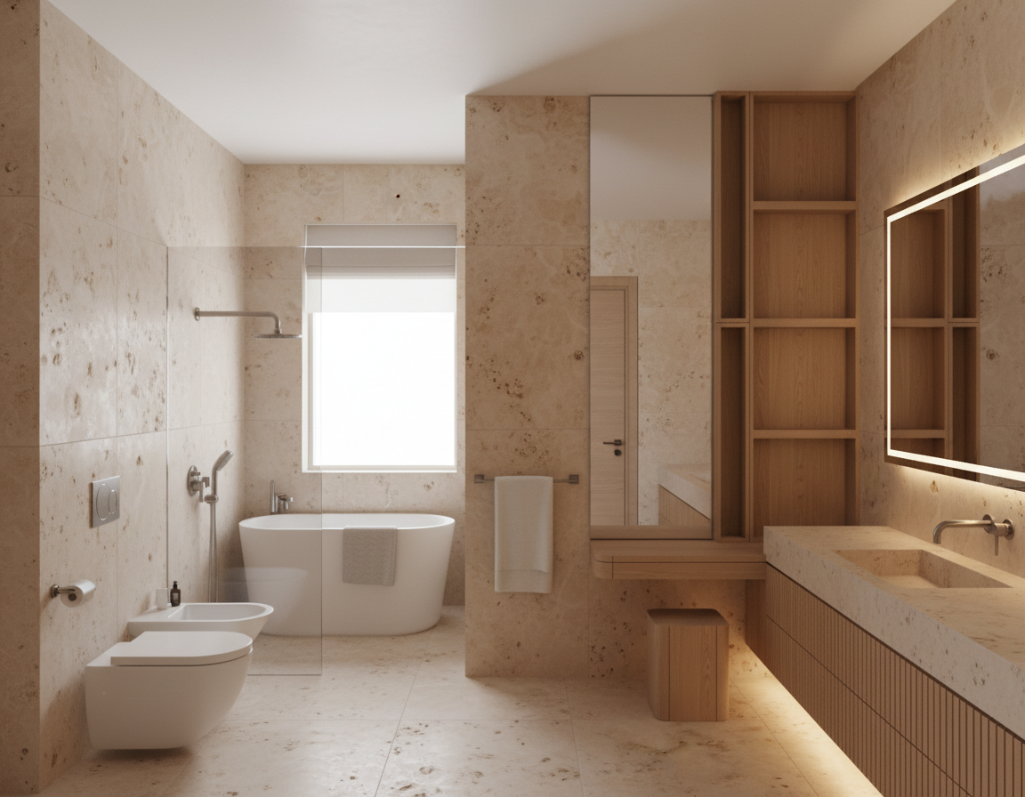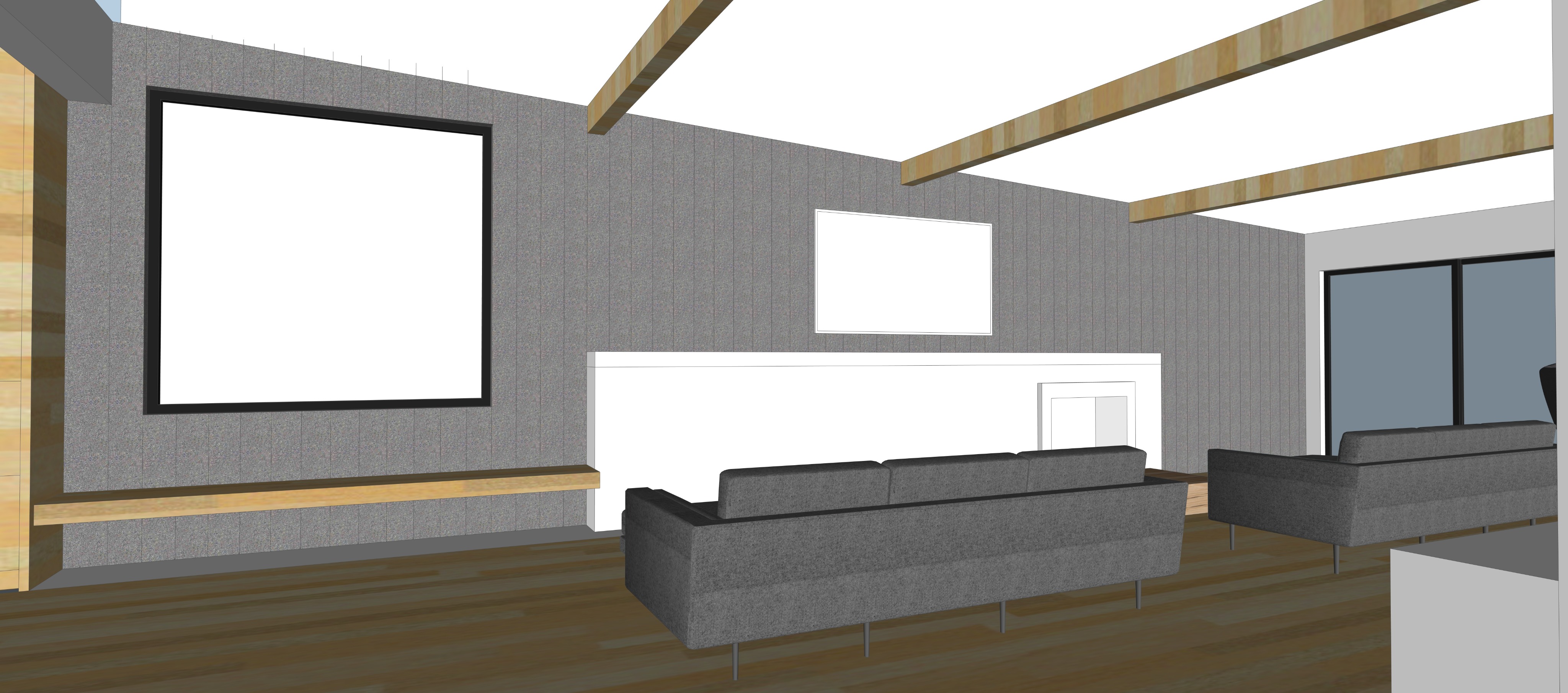 keep this same view this is an interior view of a modern home with wide plank french oak floors a shou sugi ban wall with a terra cotta tile clad fireplace and a tv on the wall 3 oak beams on a white ceiling with 4 can lights scandanavian style