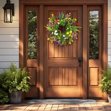 make photo realistic image of this door in deep walnut add handle in place of handle in picture replace light in image with light in reference image remove floral wreath and rug from porch place handle on right side of door make door deeper walnut image should be of full door with lights on wither side