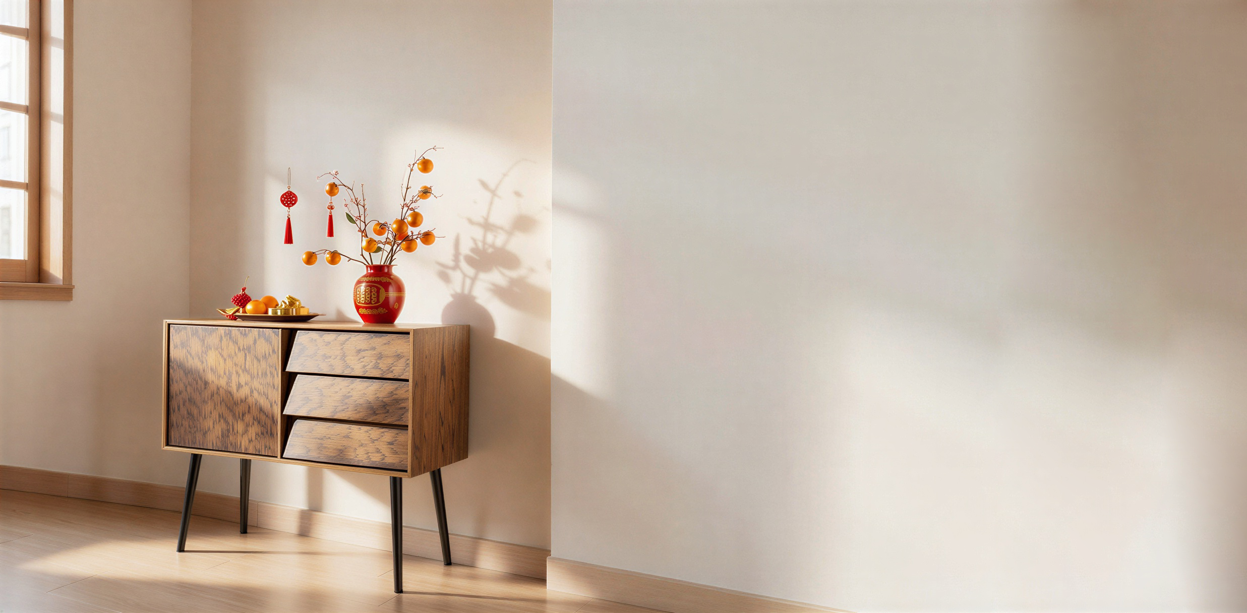 enhance the background to create a warmer more refined living space suitable for a chinese new year setting use a clean smooth wall in soft neutral tones such as warm white or light beige with subtle natural light creating gentle gradients and realistic shadows keep the wall flat even and uncluttered with no visible architectural breaks patterns or distractions keep the sideboard in the exact same position angle scale and perspective as the original image do not alter the sideboard s design structure proportions material wood grain color or orientation in any way place tasteful chinese new year decorations on top of the sideboard only arranged in a balanced and elegant way such as a red ceramic vase with mandarin oranges or auspicious branches a small decorative tray with oranges or gold ingots one or two subtle red and gold accents e g knot ornament tassel or festive charm ensure all decorations are minimal well spaced and proportional to the sideboard enhancing the festive mood without overpowering the furniture maintain soft natural daylight with consistent lighting realistic shadows and gentle reflections to highlight the solid wood texture the final result should feel clean premium and showroom ready with a festive touch appropriate for chinese new year