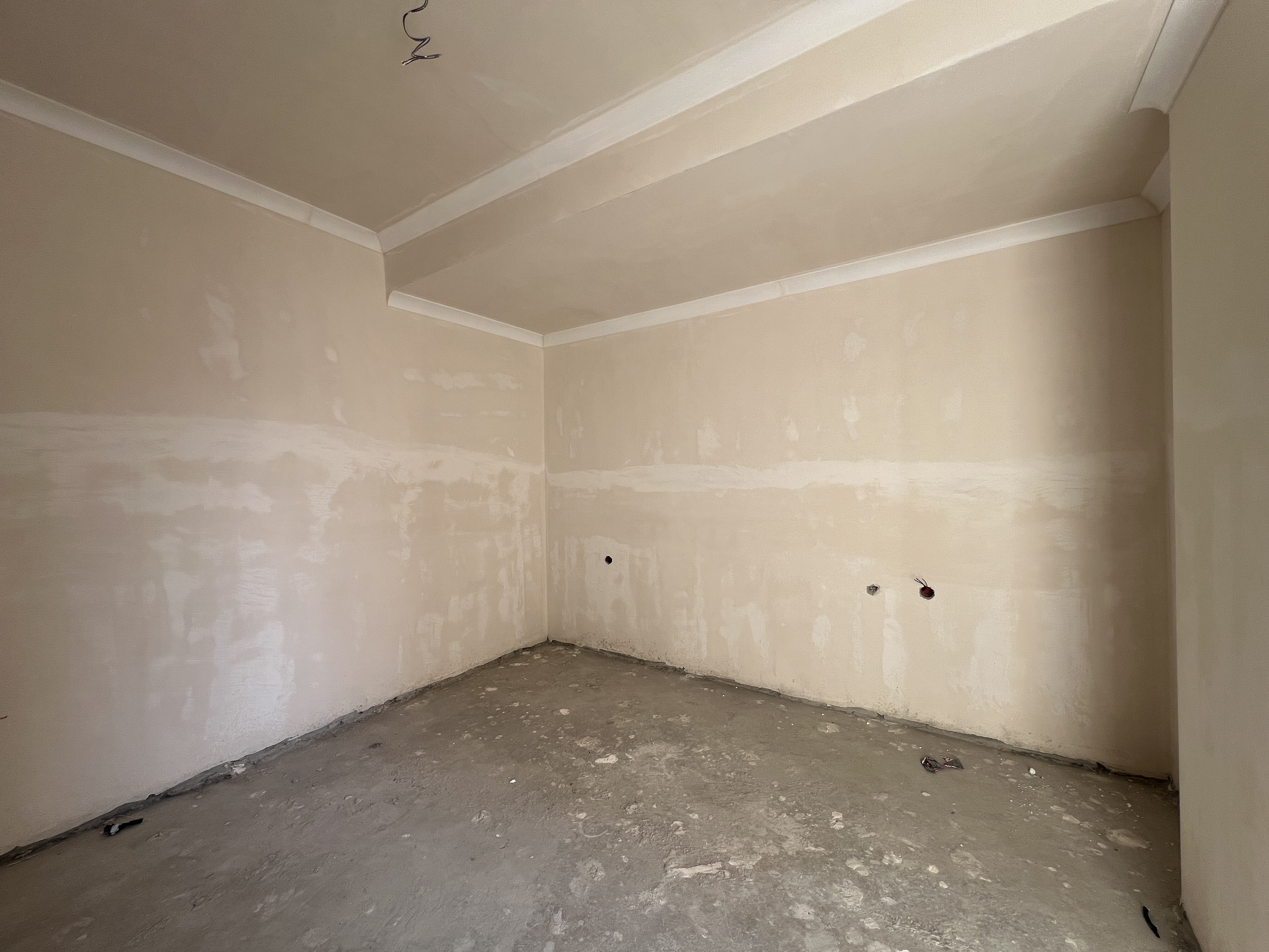 place a modern headboard against the right wall and a wardrobe next to the bed