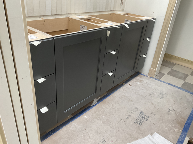 do not change the cabinets in any way preserve the exact cabinet colors materials finishes dimensions door and drawer styles hardware spacing alignment and all geometry exactly as shown do not alter the countertop shape backsplash appliances flooring lighting fixtures or wall structure only remove the construction materials clutter and mess from the scene clean the room and make it look finished and staged add a few simple tasteful home accessories appropriate for the style of the space but do not add or remove any furniture windows or architectural elements maintain the original lighting direction and realism enhance clarity and polish the photo while keeping the cabinetry and room design completely unchanged do not alter the lighting to keep the cabinet colors as they are in the image add gold knobs to the door and drawer fronts add undermount sinks add a countertop and floors stage for a bathroom vanity