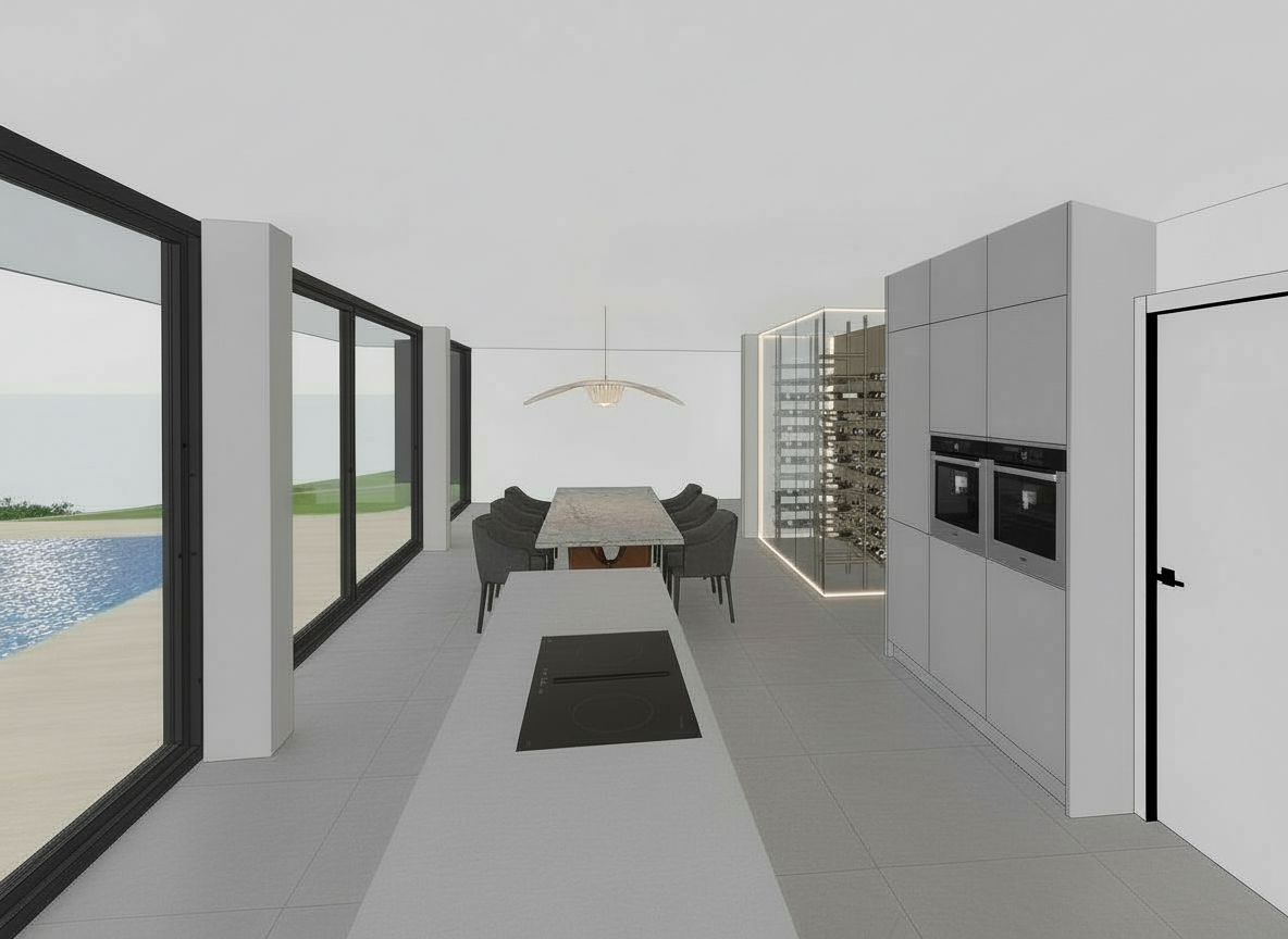 indirekte beleuchtung anders nur um den weinraum oben und an den kochschr nken in der k che kochinsel mit einer kochplatte in einer achse mit dem esstisch esstisch mit einer steinplatte weinschrank schmackhafter gro formatigen fliesen matt t r fl chenb ndig rahmenlos deckenhoch