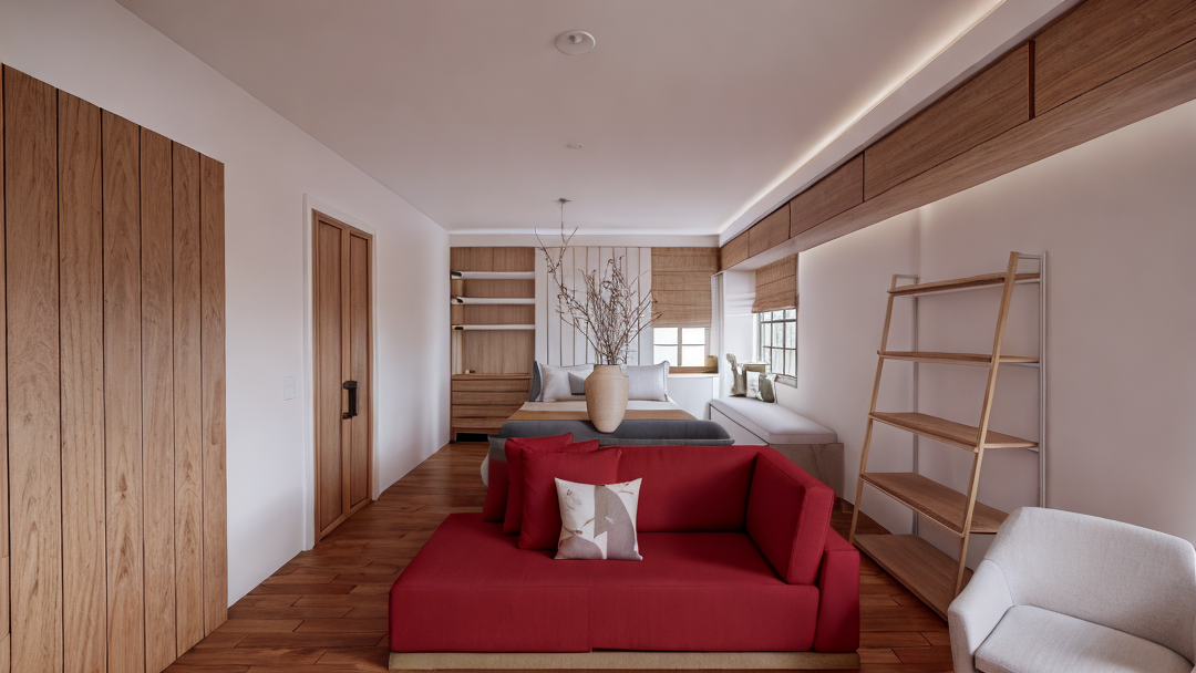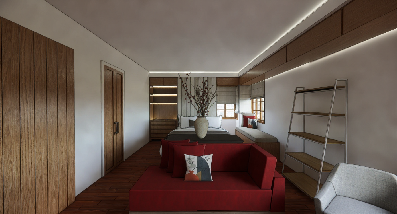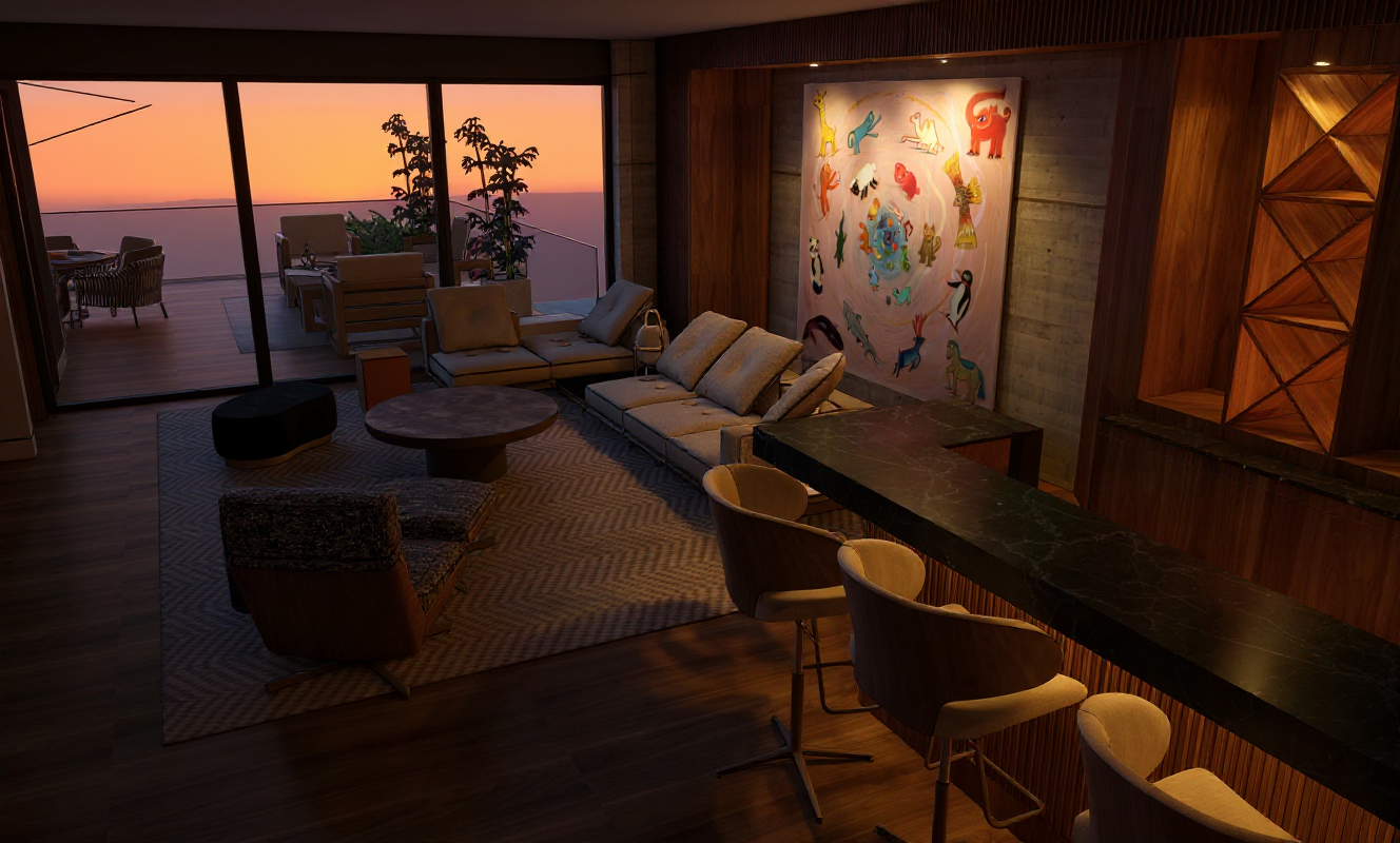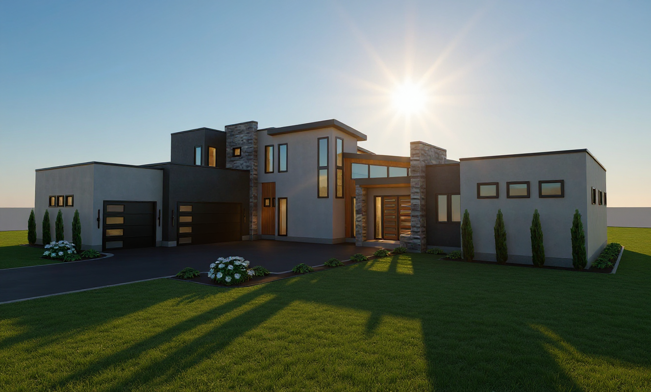 modern luxury house sleek and elegant design use a light gray stucco exterior with some portions a darker gray stucco with soft gray stone accents incorporate black window frames and a black metal roof and soffits add warm wooden elements with a natural cedar finish for the doors and decorative panels the driveway should have a smooth black asphalt texture surround the house with vibrant green grass well manicured and lush add small bushes with white flowers and tall slender dark green juniper skyrocket trees for landscaping set the scene under a bright blue daylit sky with no hard shadows evoking a luxurious and family friendly atmosphere keep ambient lighting high