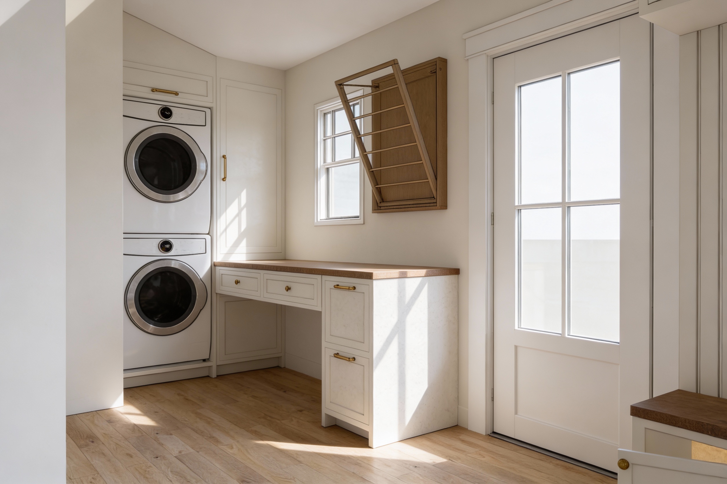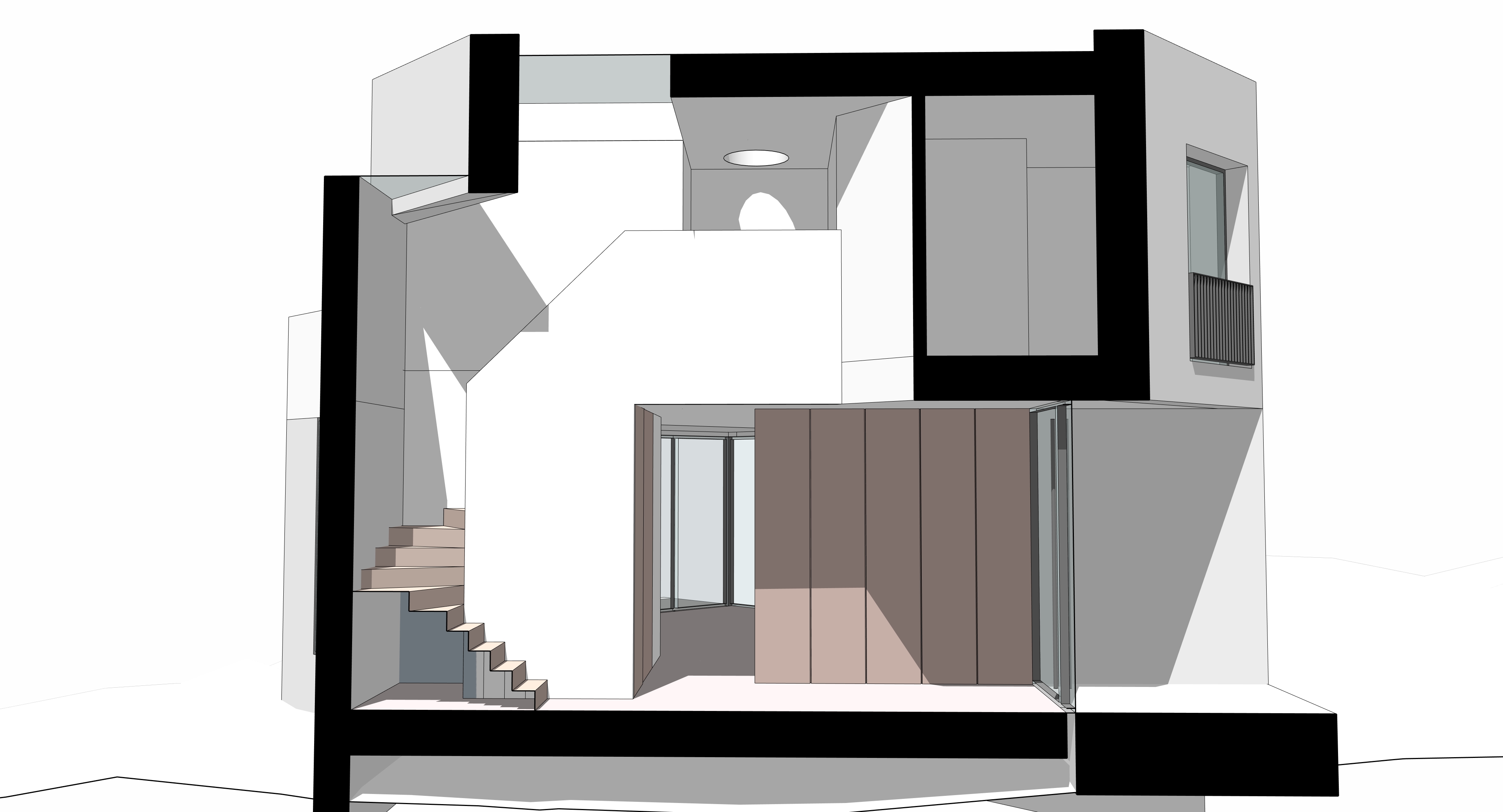 a photo real render of an internal scene the space is top lit brown colours are polished oak the floor is polished concrete
