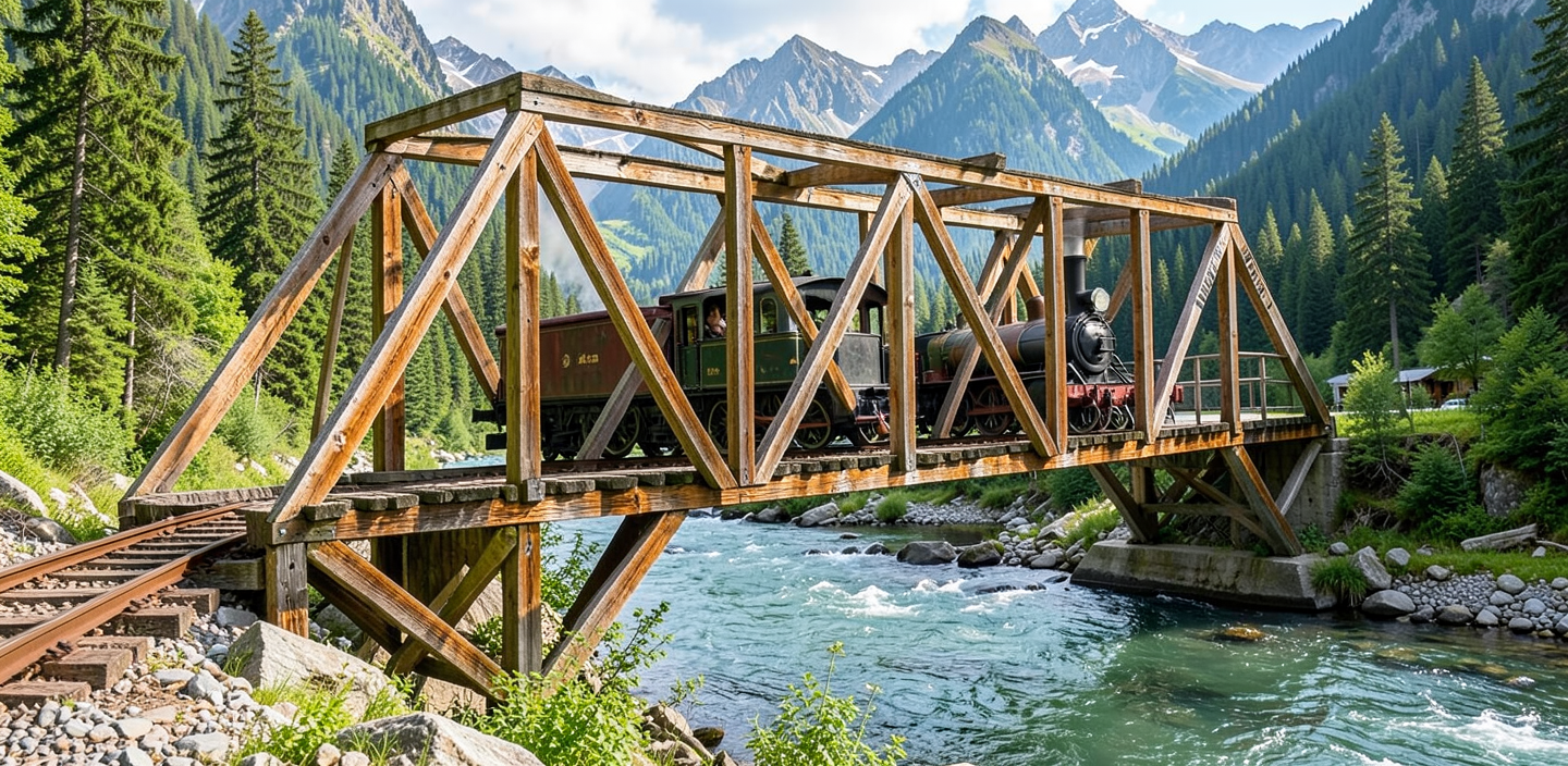 make this bridge out of nice wood timbers add an old steam engine train going through the bridge needs to be crossing a river in the mountains continue the track on the left side of the bridge have the train exiting the far side of the bridge have black smoke only 1 train