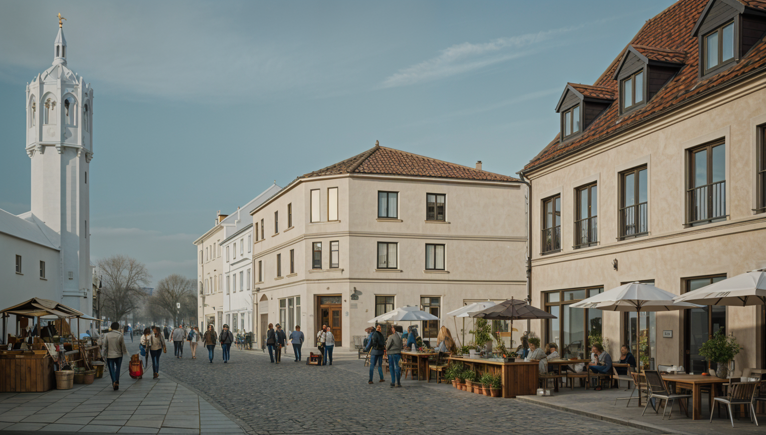 che stadtansicht einer historischen altstadt der lutherstadt wittenberg aus leicht erh htem blickwinkel vordergrund belebte stra e mit menschen die spazieren gehen an marktst nden einkaufen und in caf s sitzen stra enszene authentisch und lebendig keine bertriebenen menschenmassen linke h lfte maskiert schlosskirche wittenberg fixieren die linke bildh lfte zeigt die schlosskirche wittenberg exakt wie im originalbild keine nderungen keine k nstlerischen anpassungen keine perspektivverschiebung keine farbkorrekturen die kirche bleibt 100 unver ndert beschreibung der turmspitze der schlosskirche wittenberg turmh he 88 meter markantes wahrzeichen der stadt wittenberg turmhaube neugotisch kupfergedeckt feingliedrige verzierungen turmhelm spitz zulaufend endet in einer schlanken spitze gekr nt von einem goldfarbenen wetterhahn rechte h lfte fixieren existierende geb ude unver ndert die rechte bildh lfte bleibt exakt wie im originalbild niedrige bis mittelhohe geb ude mit roter dacheindeckung deutsche dachformen historische materialien wie putzfassaden holzfensterrahmen zur ckhaltende moderne akzente dezent stra enszene caf s und menschen tageszeit goldene stunde weiches sonnenlicht stimmiger schattenwurf fokus auf historische genauigkeit st dtische integration nat rliche perspektive beide bildh lften absolut fix keine nderungen am originalbild