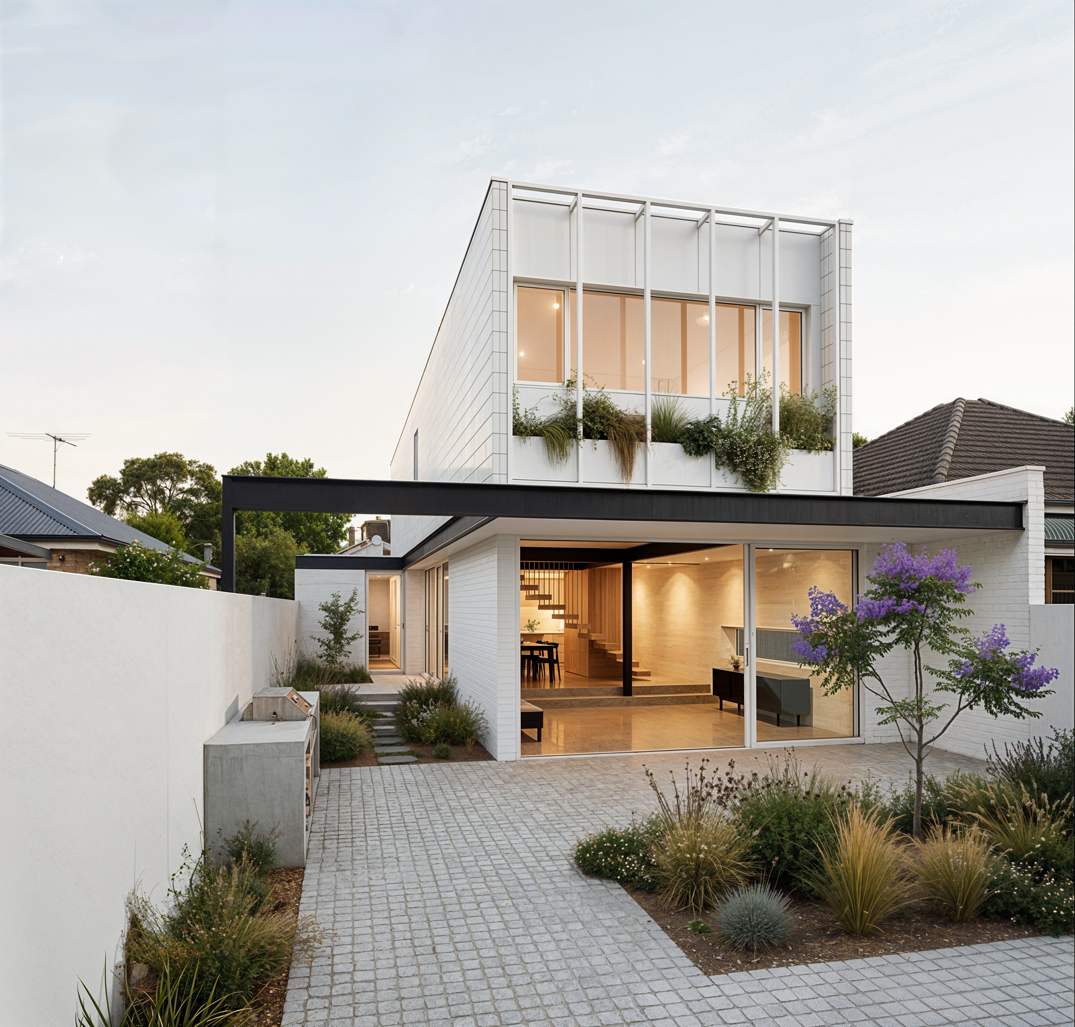 exterior image it is very important not to change the base geometry there is a metal beam between the upper and lower volumes it is a c shaped metal beam with the open side facing outward the beam must be white remove the barbecue on the left side and replace it with border planting low plants add a barbecue on the right side placed under the roof canopy there should be no barbecue on the left side inside the house in the space closest to the camera add a dining table and remove the black armchair on the upper level an empty gap is visible on the front fa ade between the steel profiles and the wall add an overhang eave behind the steel profiles to fill this space on the rear left terrace remove the tree and add an outdoor table made of metal steel iron keep everything else exactly as it is