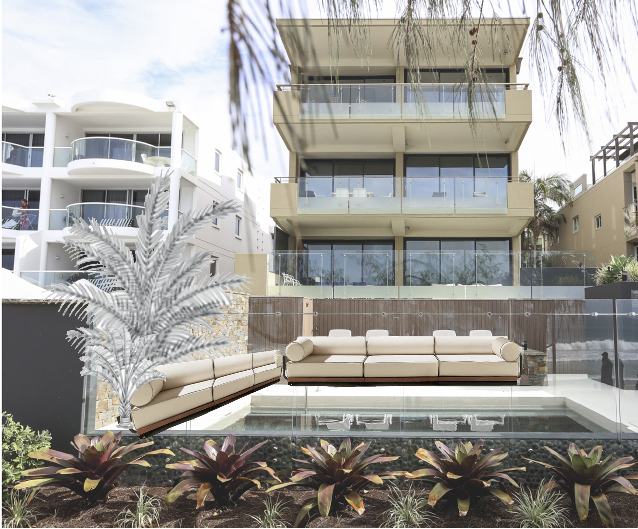 make couches built in lounges instead make the pool have a border of blue and green tile have the white stone surrounding the pool be crazy pave have the tree sketch become real extend built in furniture to exceed to the exterior wall remove steps to wall