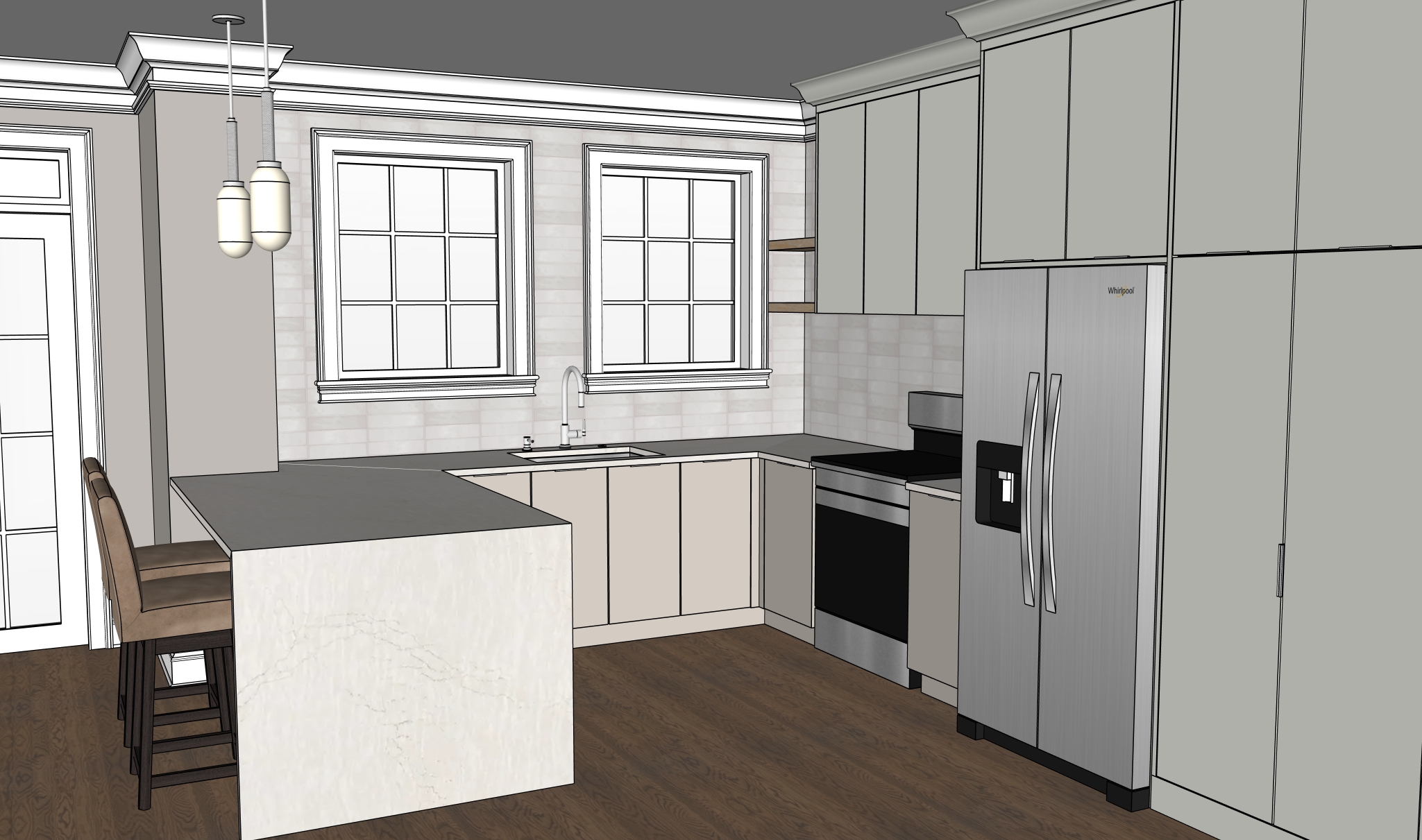 base cabinets slightly darker than wall and tall cabinets all cabinets in a matte finish stone and countertops in a matte finish add some greenery outside the windows