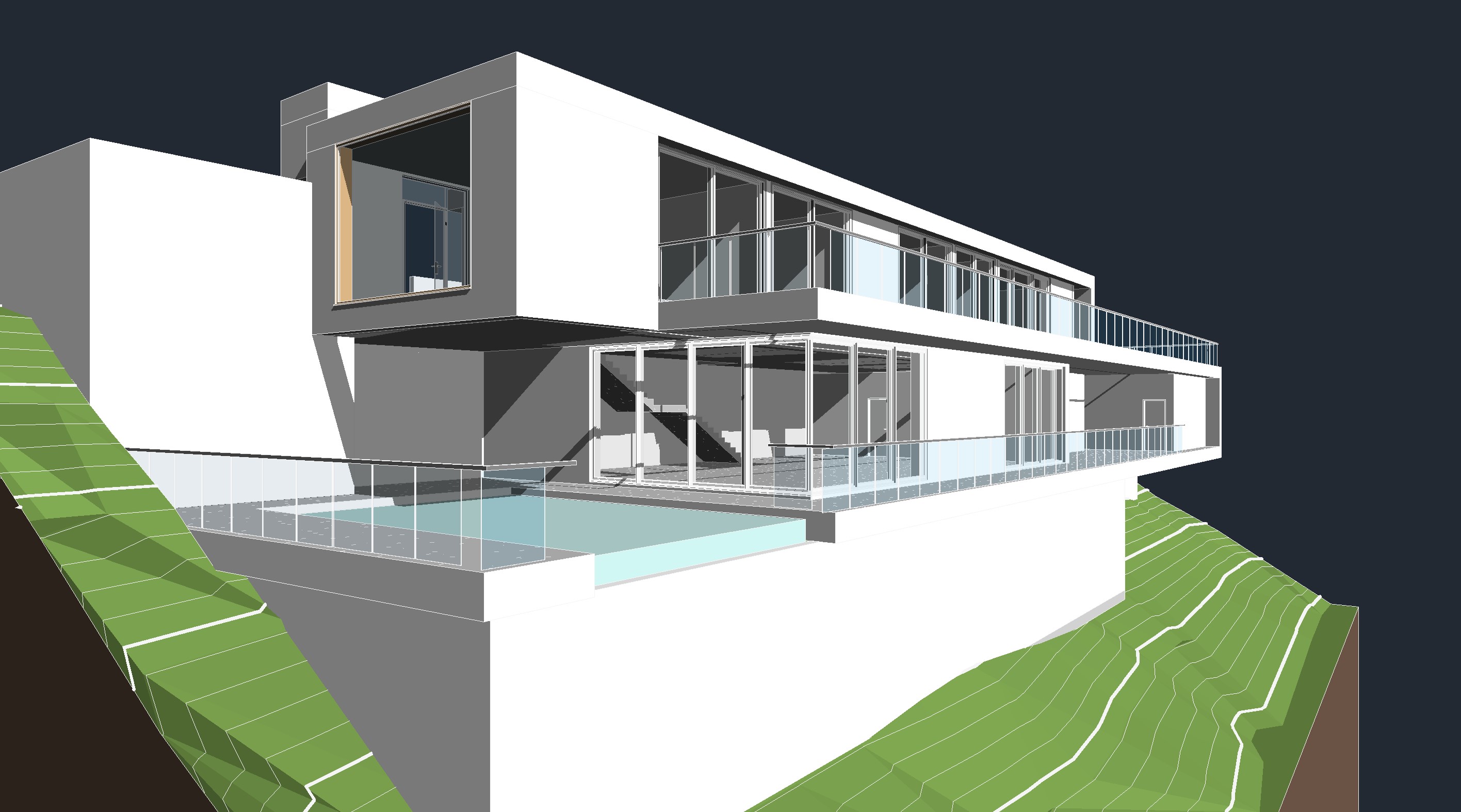modern house in pacific palisades ca with smooth white stucco and polished limestone accents expansive glass with aluminum frames frameless glass railings and infinity edge swimming pool people on the deck vegetation down below sunny california weather