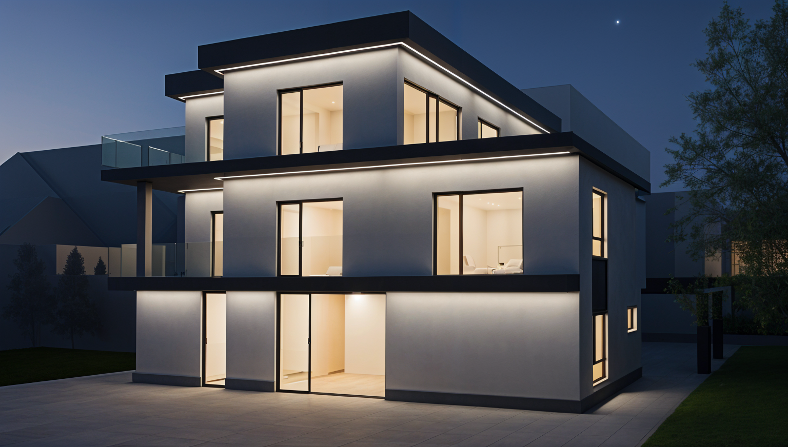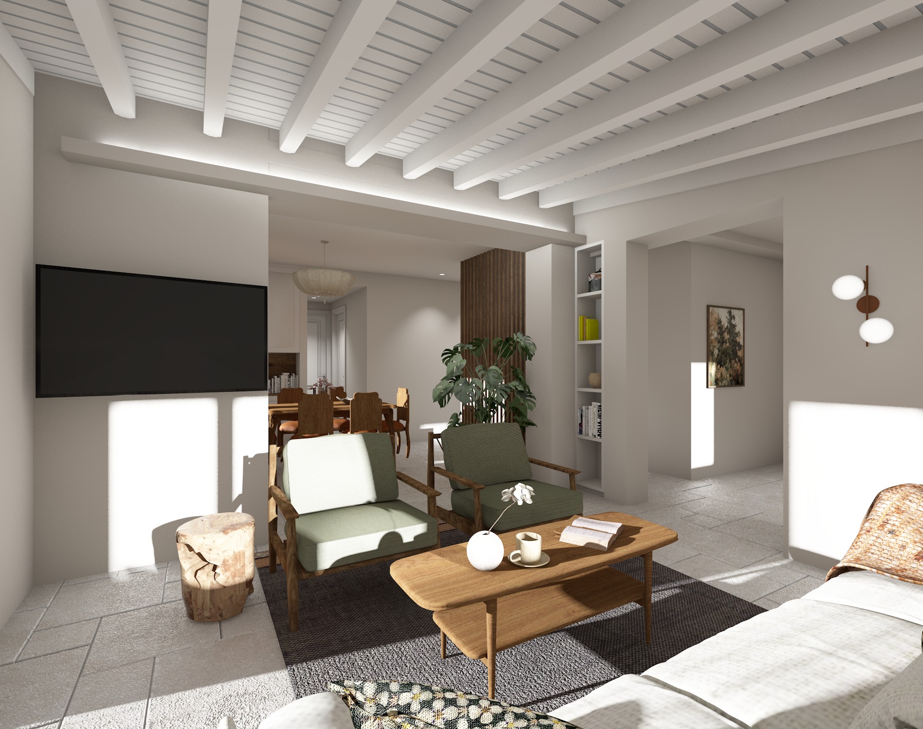 realistic daylight cozy house with realistic textures the roof is off white with lighting on the celling the celling bright there is light on the false celling bright