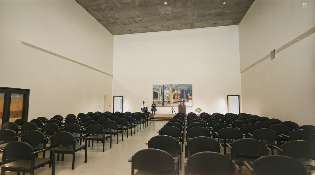 its a living room with vaulted ceiling add lighting fixtures ceiling fan and curtains to the windows the dining table is dark wood with a crystal top