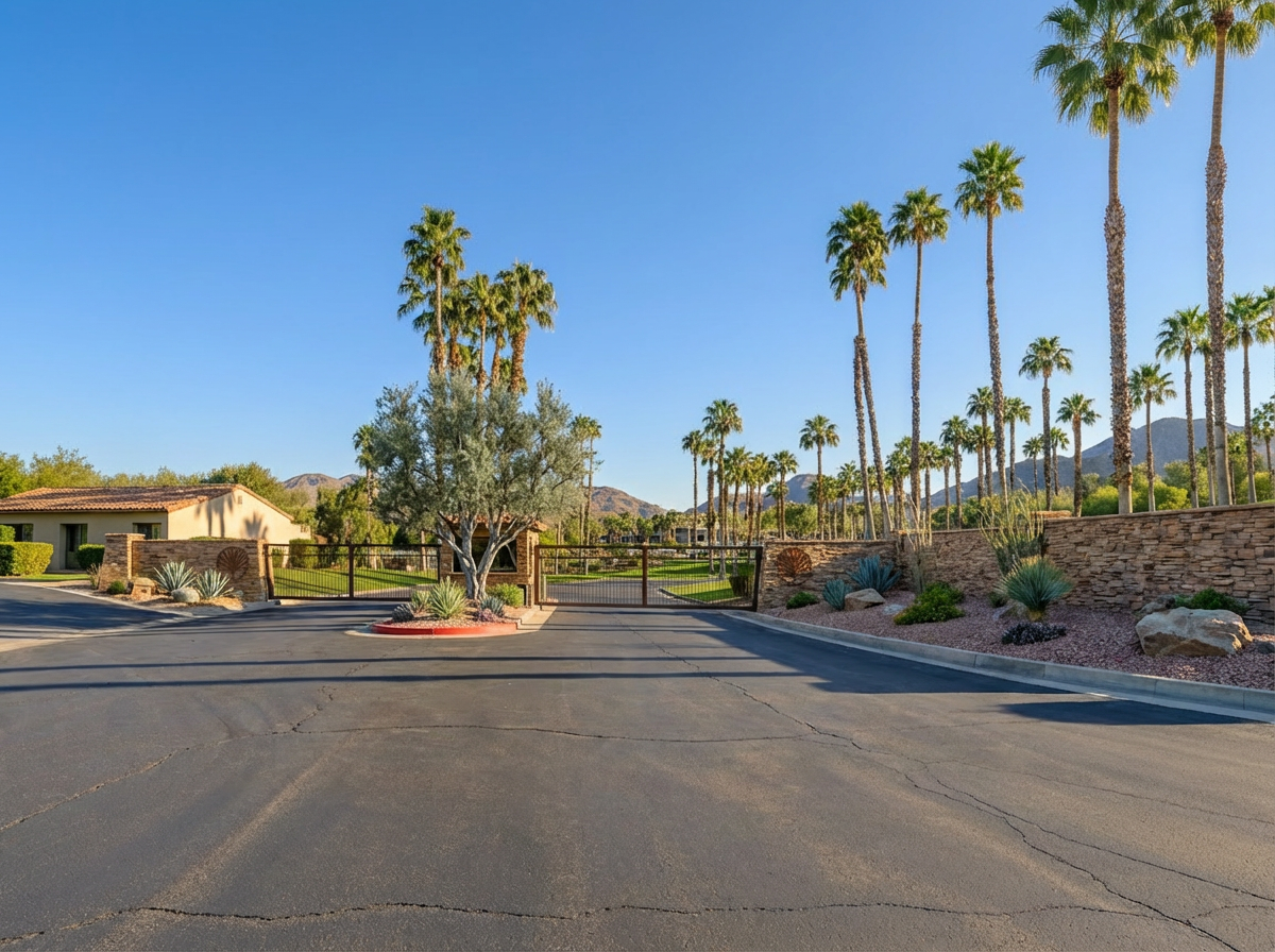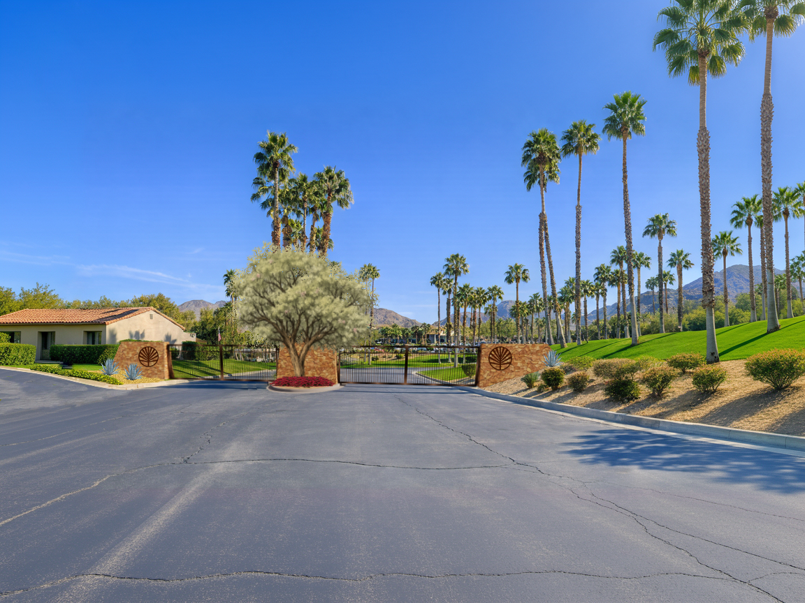 keep roads walls and gates all without changes add boulder and desert plants left side and make the central tree a deseet ironwood