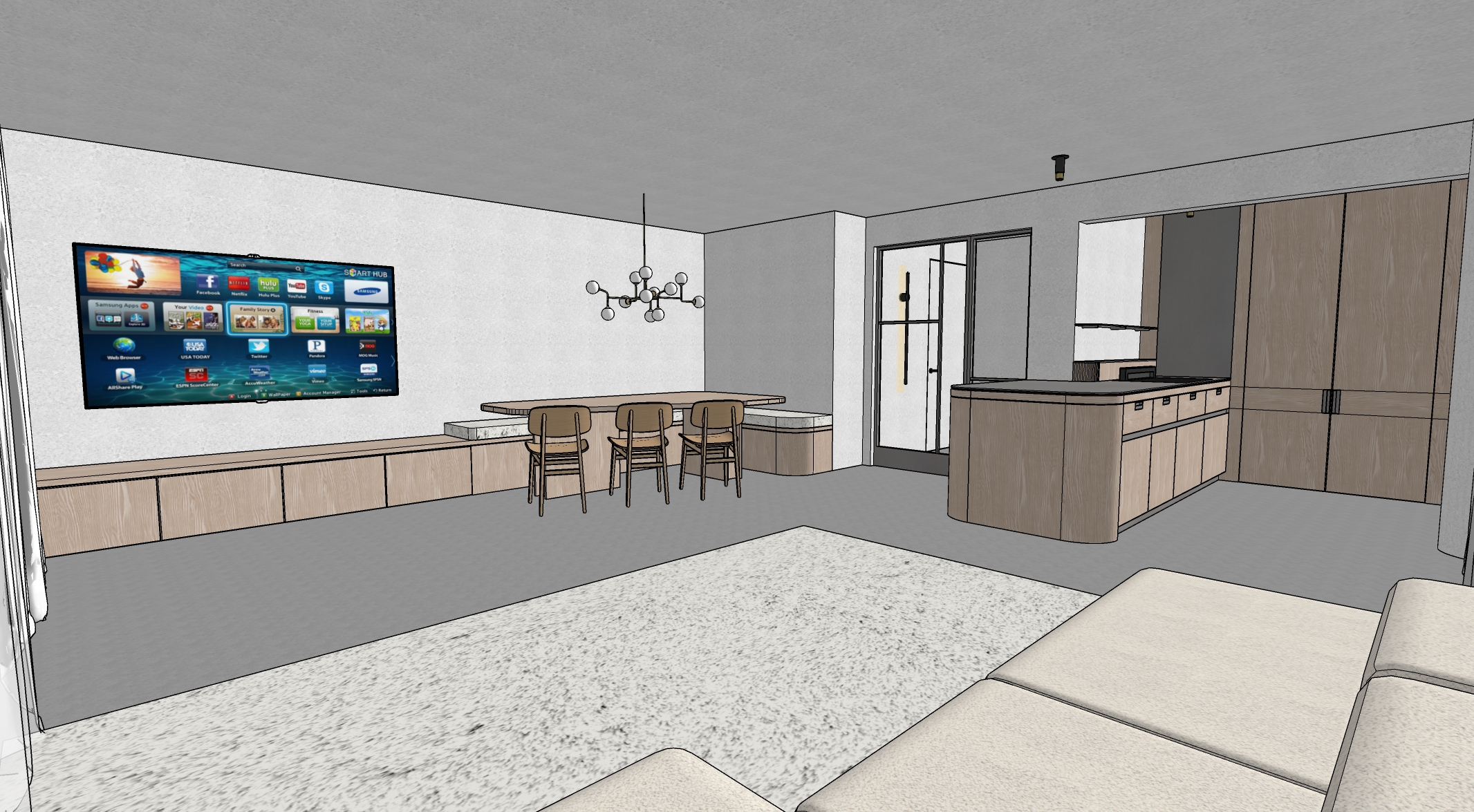 make photo realistic add lighting wood is light oak add more natural lighting change glass to not see true glass in stripes add lighting pillow needs to be nicer