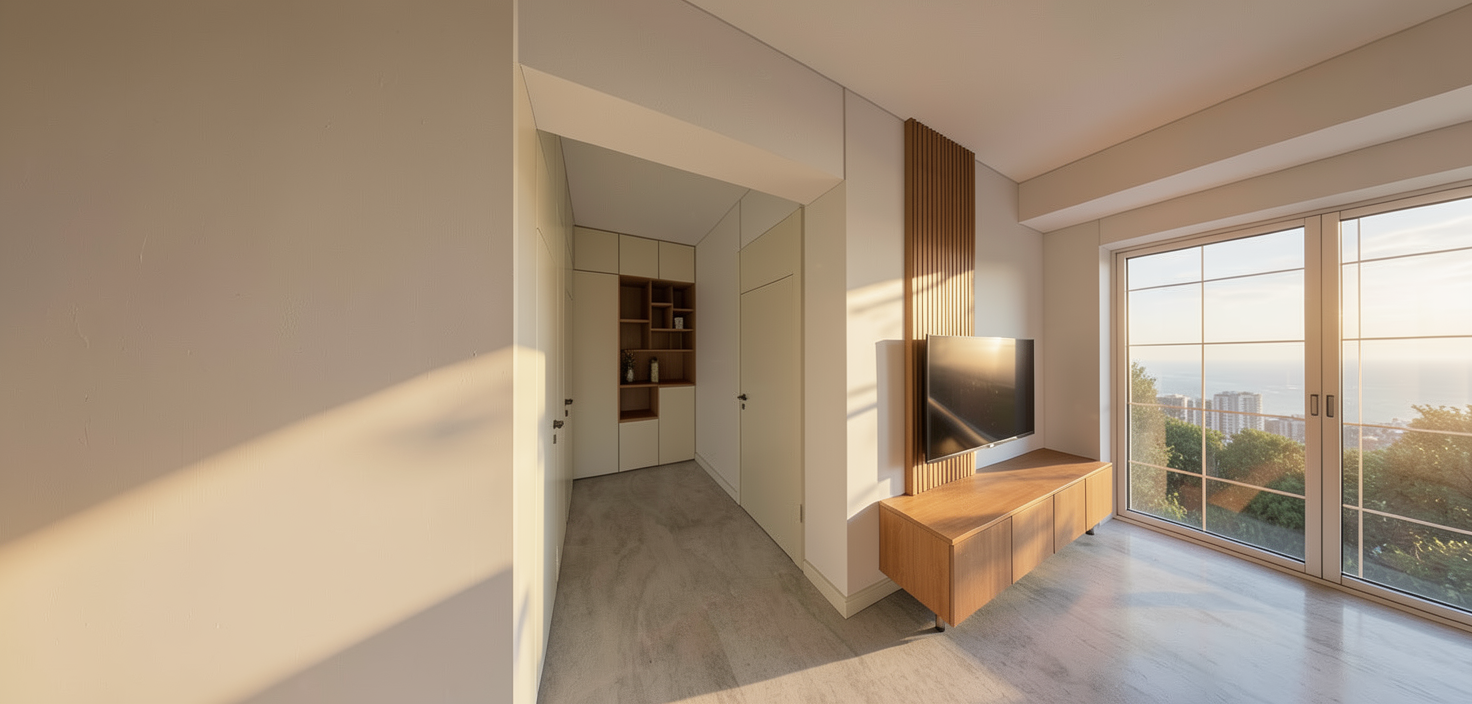 create an ultra realistic image without changing any of the structure shape design or materials don t resize the jpeg use a glossy light beige marble texture for the floor don t change the color material or shape white kongliong off white wall white ceiling ligth beige fabric sofa and chair white marble top table flat white plafon add indirect at shelf in back is white cabinet wooden table leg