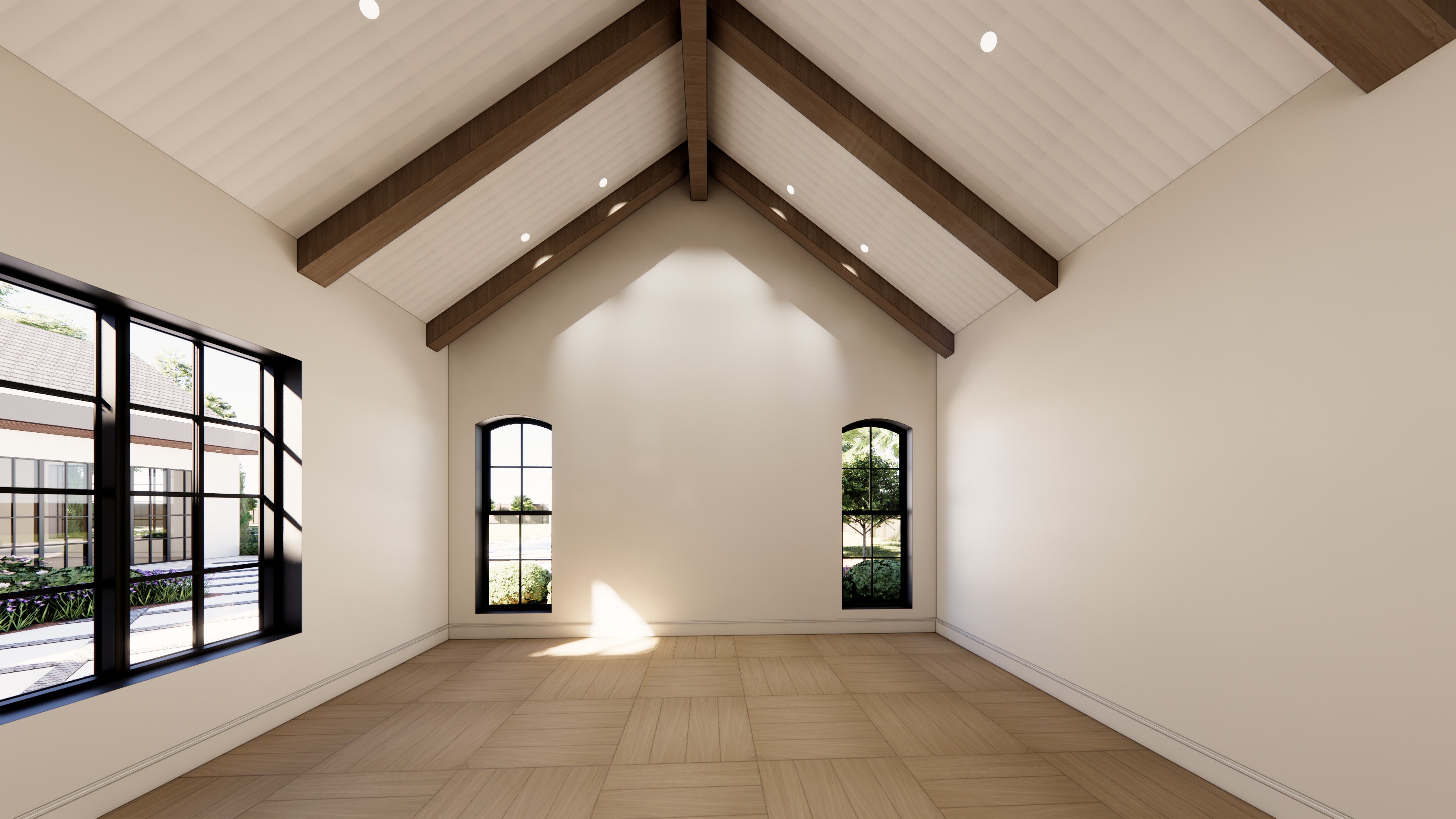 convert this architectural rendering into a highly realistic editorial style architectural photograph maintain the exact architecture geometry layout proportions materials and design details exactly as modeled do not redesign restyle add remove or reinterpret any elements do not introduce new furniture materials fixtures or architectural features this is the same bedroom shown from a different camera angle only the viewpoint changes the goal is to increase realism only making the image appear as if it were captured by a professional architectural photographer for a luxury real estate editorial listing enhance realism through soft natural daylight entering through the windows balanced exposure typical of luxury real estate photography accurate material textures and natural scale subtle shadow depth and natural light bounce refined highlights and soft reflections crisp lens clarity with natural perspective materials already present in the space include wide plank basketweave wood flooring walls painted sherwin williams origami white wood ceiling beams scalloped origami white plaster ceiling between the beams wood stained doors material realism should include wood flooring showing authentic grain natural tonal variation and subtle matte finish plaster ceiling surfaces appearing soft and sculptural with gentle shadowing that reveals the scalloped detail wood beams showing natural wood texture and realistic depth wood stained doors appearing refined with visible wood grain the doors should remain wood stained with no hardware added the exterior doors and windows have black frames exactly as shown in the rendering and must remain unchanged all materials should appear soft and natural with smooth tonal transitions no harsh lines and no exaggerated contrast lighting should feel like soft natural daylight creating subtle highlights and smooth shadow gradients across surfaces the final image should read as a luxury editorial architectural photograph calm refined highly realistic and professionally photographed
