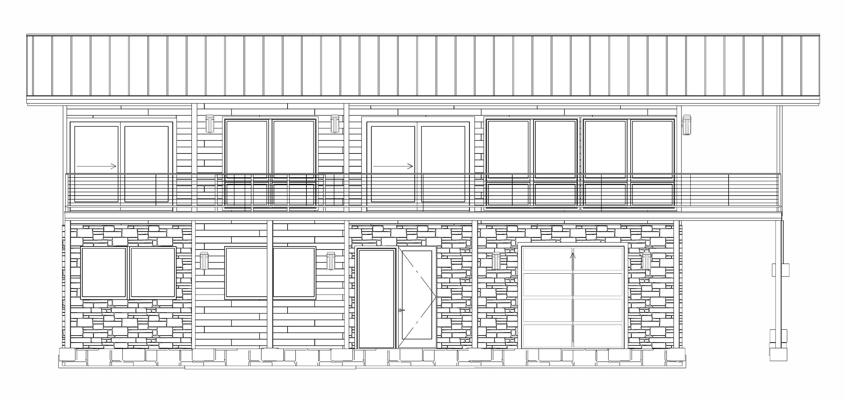 modern style with blue grey siding with warm modern horizontal wood feature bump out lower level has stone veneer except for where the wood feature bump out modern zen landscaping with lush bushes trees and large rocks