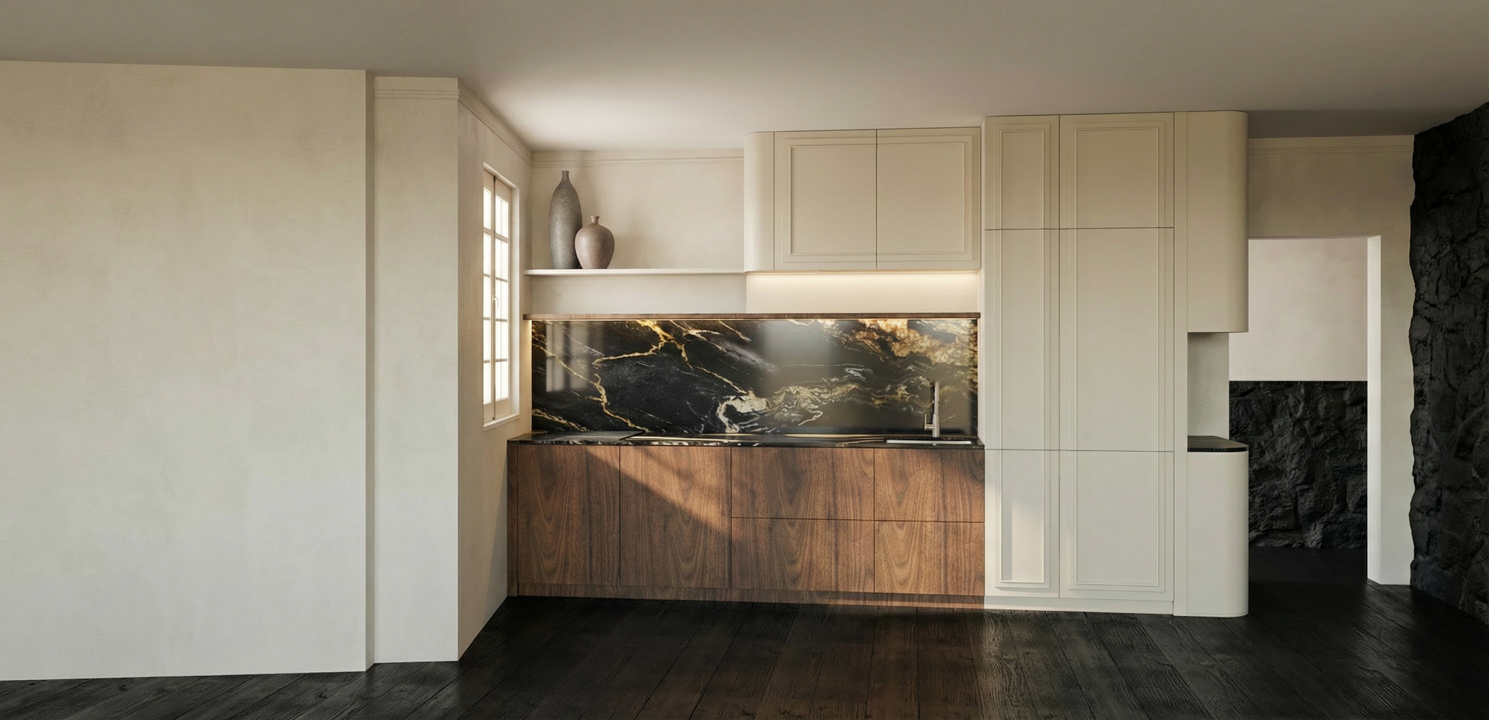 use exact building geometry from the provided elevations there are 4 elevations on one sheet do not change proportions roof slope footprint or window positions do not redesign the building apply only facade treatment and lighting design keep structure identical to drawings no new volumes no extra buildings no reinterpretation