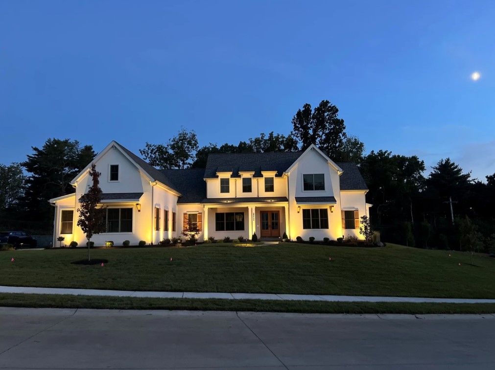 create a softer dusk view of this exterior with more vegetation