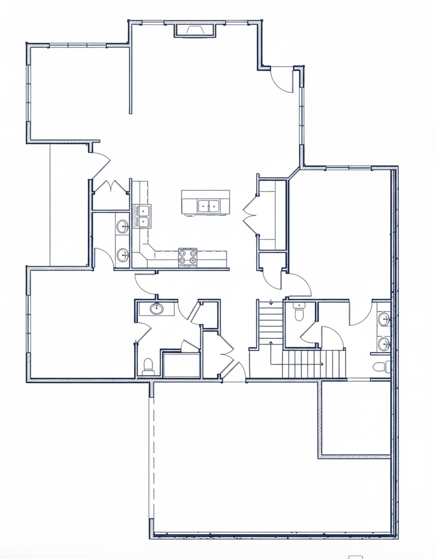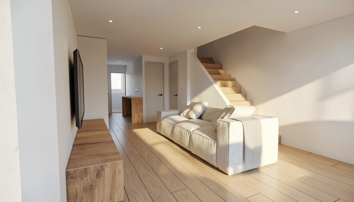 photorealistic mediterranean style render do not modify geometry layout main furniture or materials enhance realism only natural warm mediterranean daylight soft global illumination balanced exposure realistic soft shadows add subtle material textures plaster walls wood grain natural stone fabrics warm white lighting 3000k add small recessed white ceiling spotlights minimal modern add 2 3 minimalist mediterranean bar stools at the kitchen island light wood neutral fabric elegant and simple accurate reflections ambient occlusion slight imperfections for realism clean elegant mediterranean atmosphere high end architectural photography look