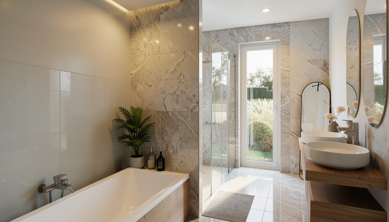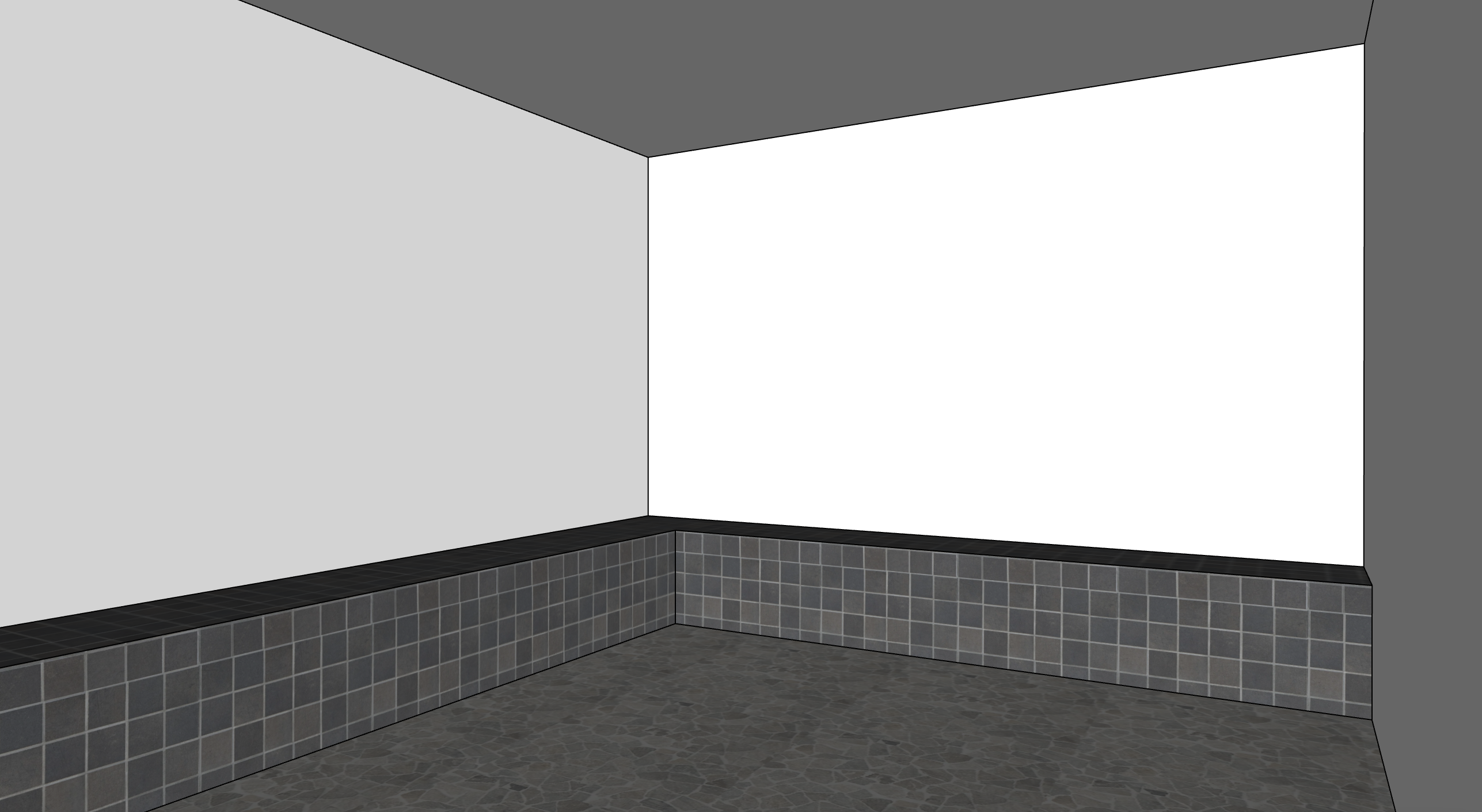 modern steam room maintain parameters of the room add people in bathing suits sitting on the bench add modern tile on the walls and ceilings with a little shimmer