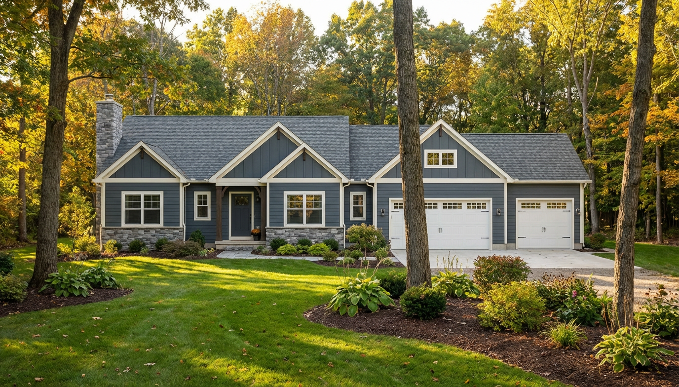 make as photorealistic as possible professional landscaping in a lightly wooded scene in ohio at 3 pm remove any text keep materials where shown using these colors siding 45535c trim fafbf7 roof pewter shingle certainteed dry stack erie grey stone provia where shown smooth concrete foundation 2 panel front door 40495a post 645643 white windows