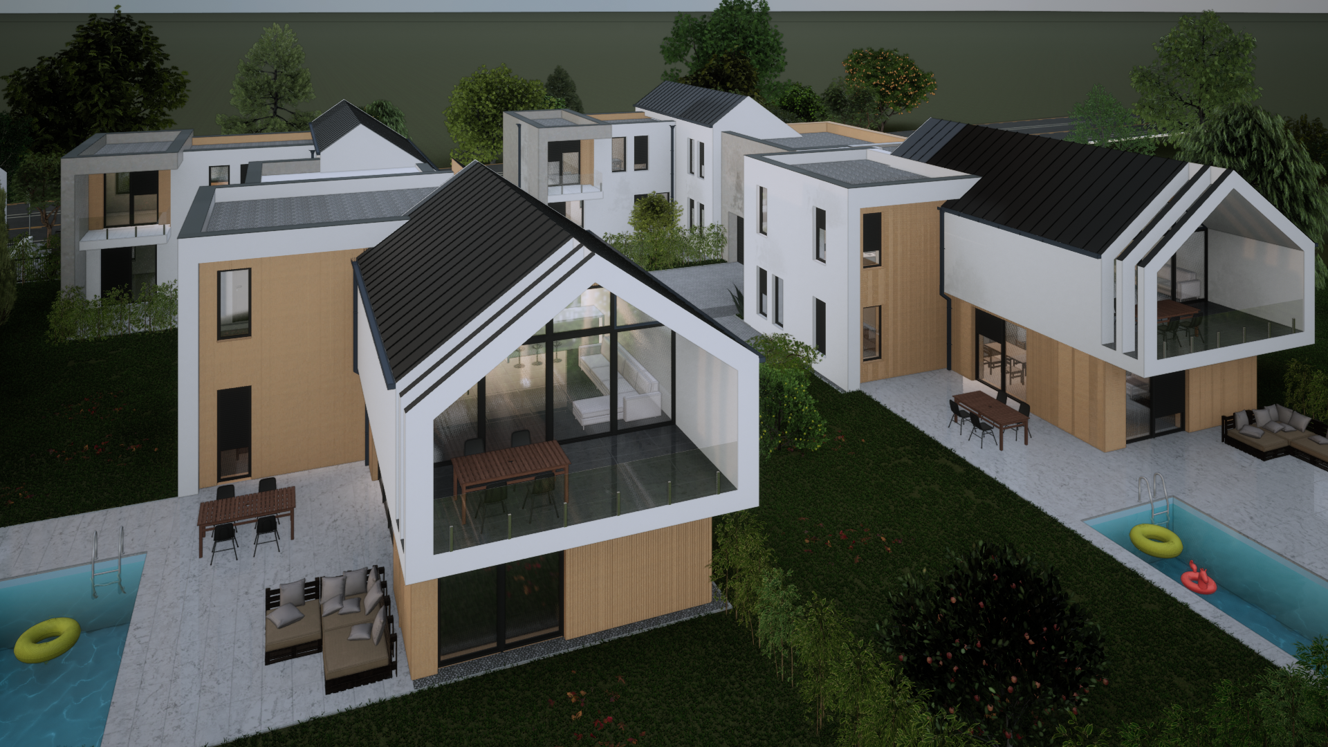 exterior shot modern cubic villa wood facade realistic 3ds max clear softsky afternoon sunlight with shadows creating a sense of depth and warmth architecture architecture