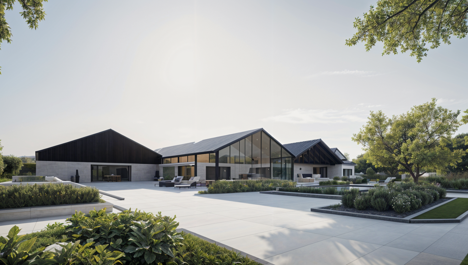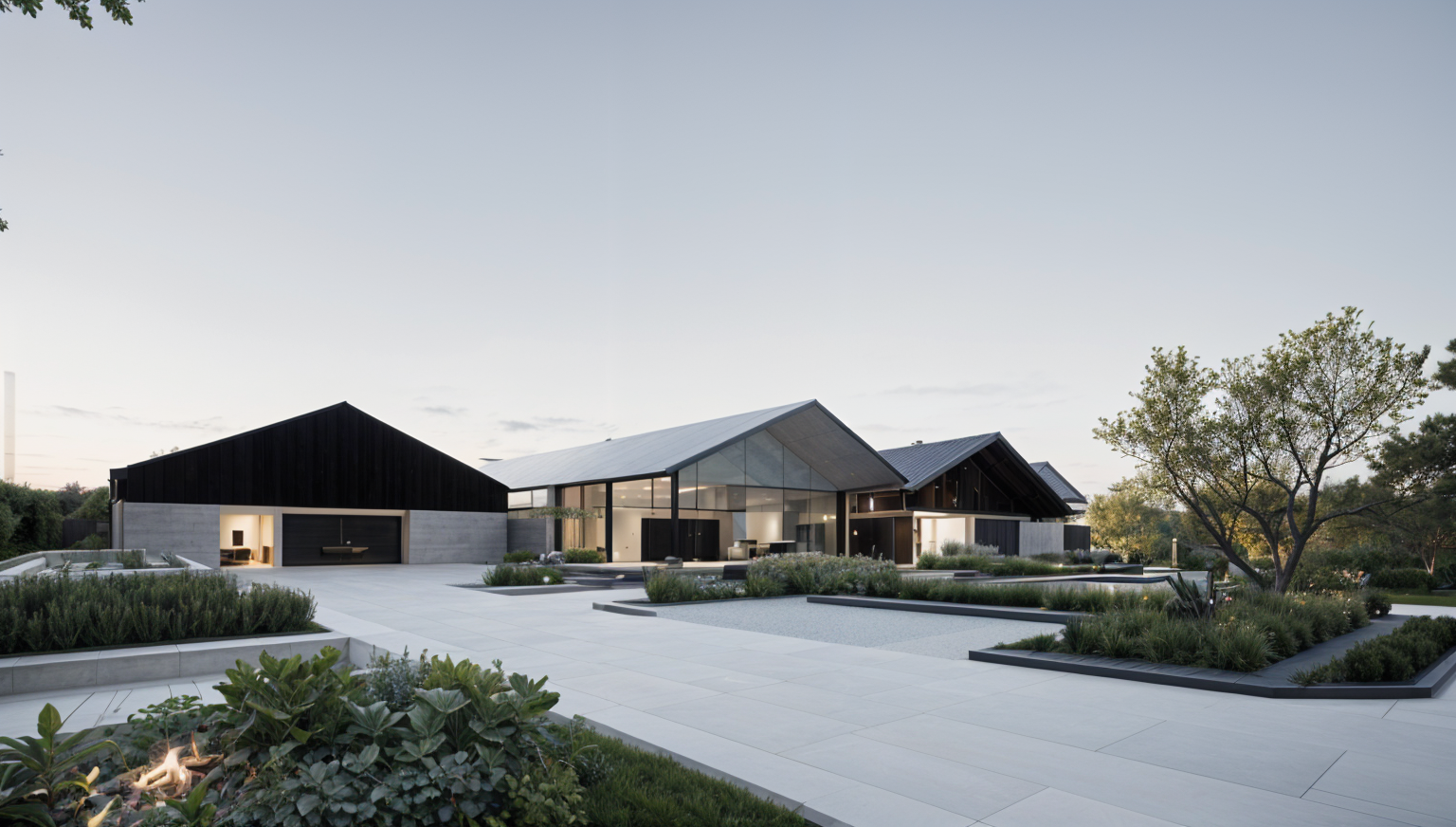 modernist night shot the image features a modern four story building with a sleek grid like facade made of vertical slats illuminated from within it is set against a dramatic twilight sky filled with softly lit fluffy clouds tinged with hues of pink and orange the surrounding landscape is manicured with neatly arranged trees and shrubs framing the scene a pathway leads directly to the entrance of the building creating a welcoming and serene atmosphere architecture