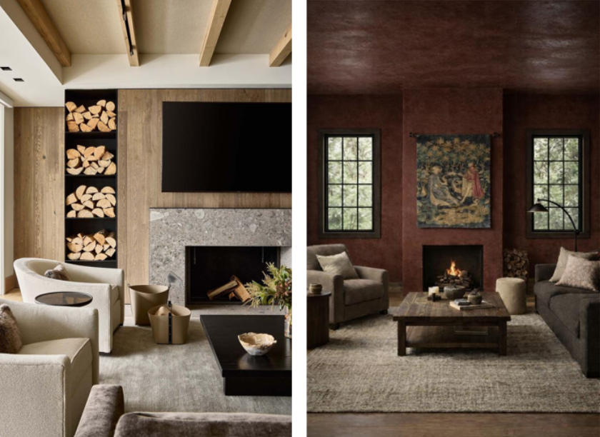 create a cozy living room scene split into two distinct styles on the left a modern design with light beige walls and light wood paneling featuring a sleek wall mounted black tv above a natural stone fireplace include contemporary light beige armchairs and soft natural light coming through large windows use a soft gray rug and dark coffee table to complement the warm neutral tones on the right channel a rustic traditional atmosphere with deep burgundy walls and a textured burgundy ceiling place a vintage tapestry above a crackling fireplace add dark gray plush sofas and earthy dark wooden tables illuminate the space with warm ambient lighting through black framed windows ensure both spaces convey warmth comfort and contrasting styles harmoniously