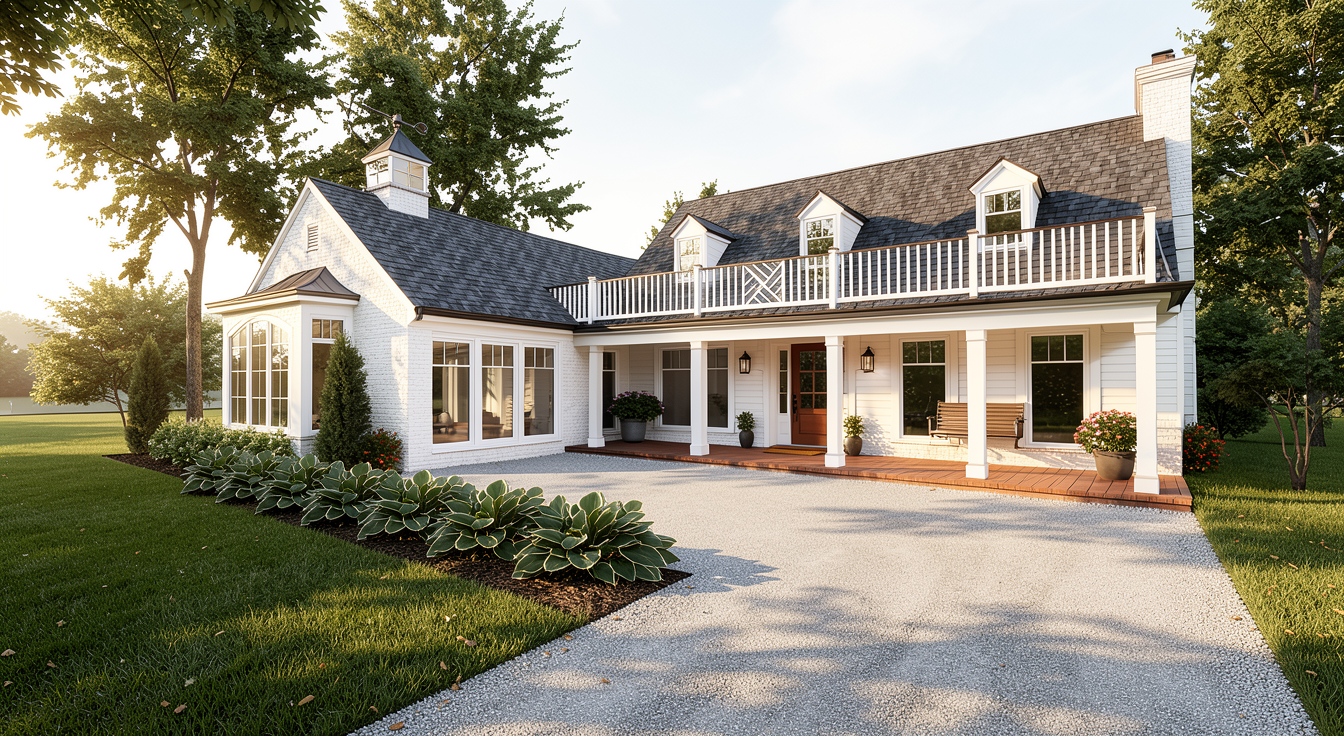 render a beautiful house with a modern architectural design the exterior features a mix of light gray and stone accents the roof is a sleek dark charcoal gray the doors and window frames are a crisp white for contrast the atmosphere is serene and inviting with soft natural daylight illuminating the fa ade surrounded by lush green landscaping that enhances the welcoming feel