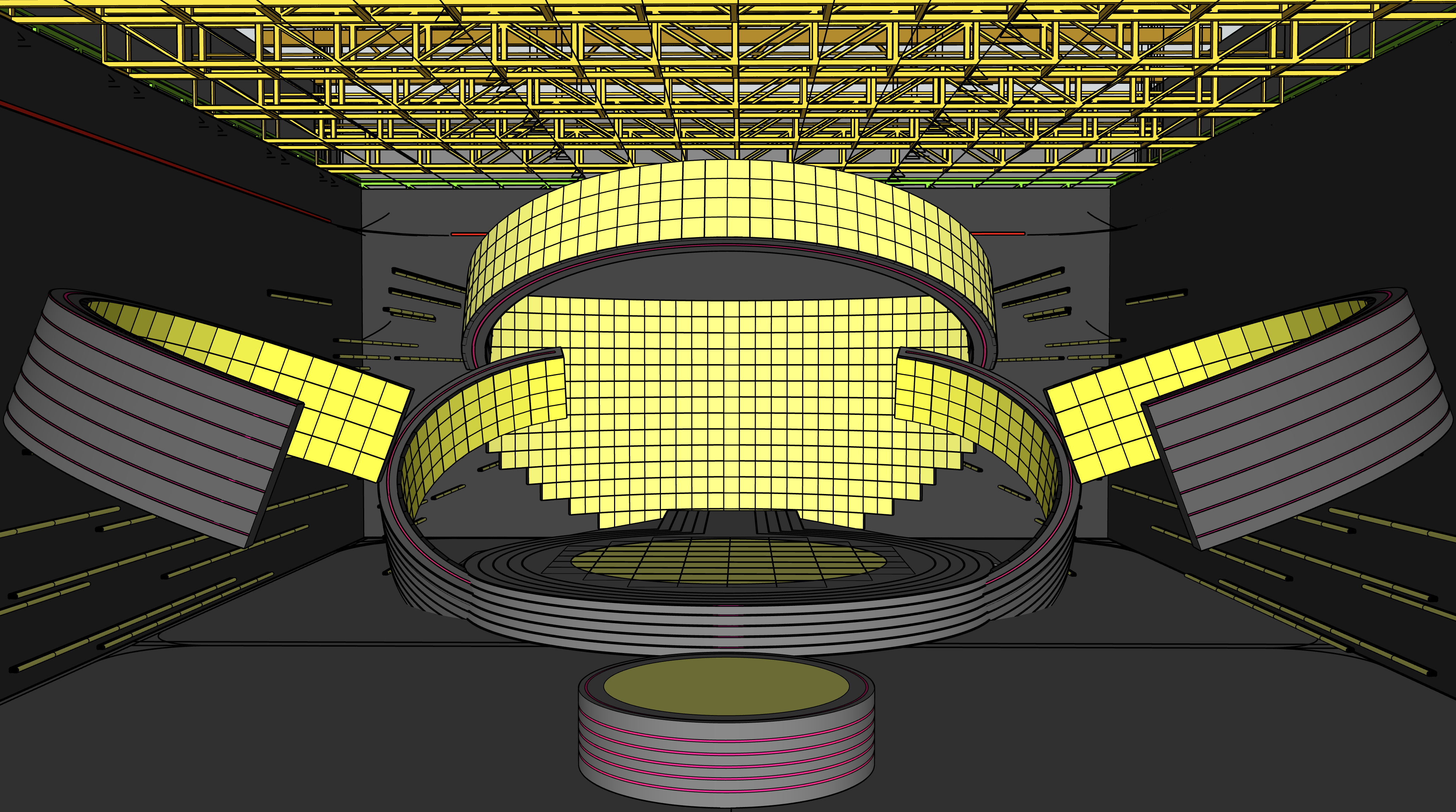 eurovision styled stage lighting neon led tapes light beams from all around black and white video content on yellow led screen tiles