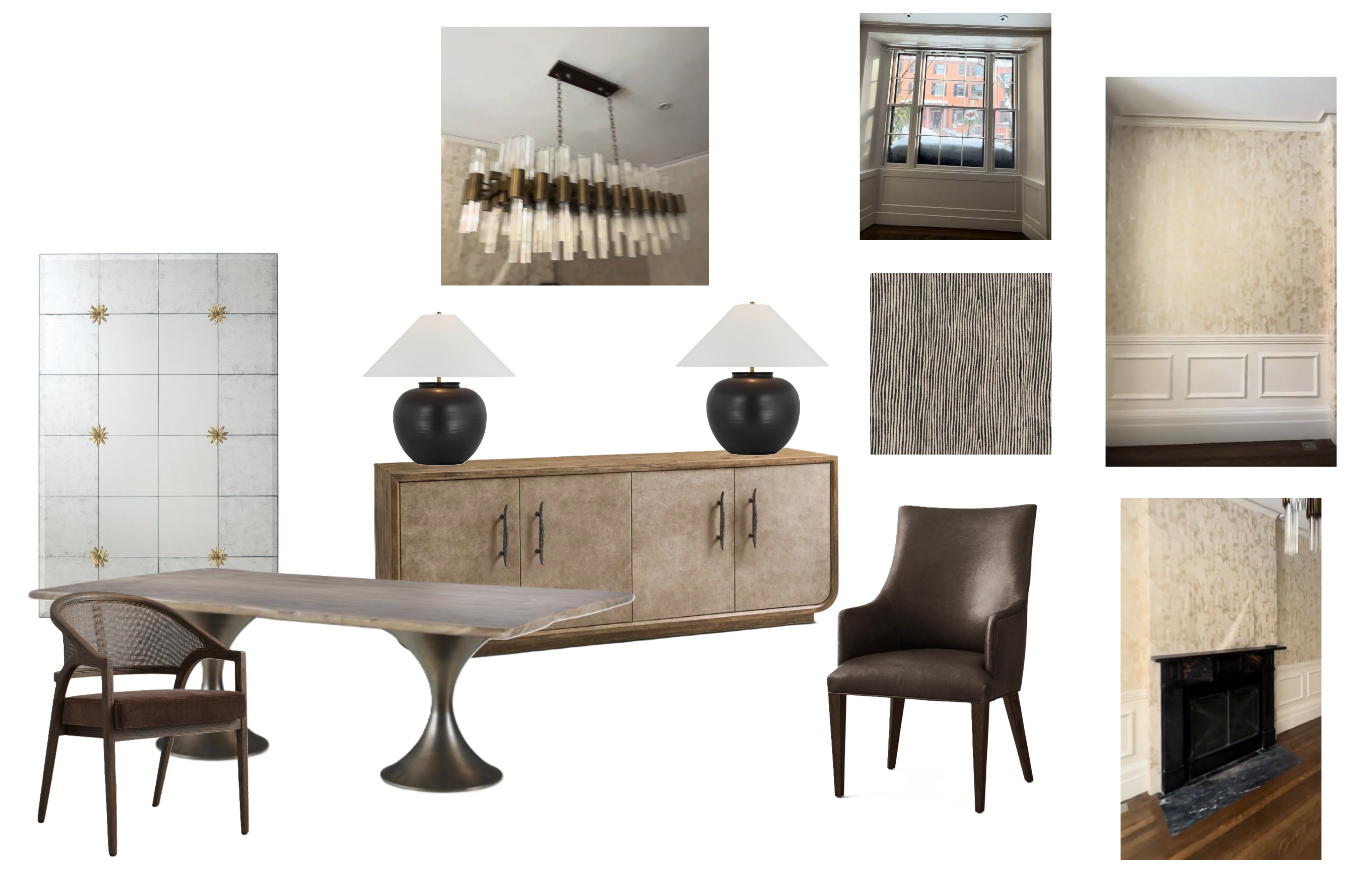 room orientation establish the room with the following fixed architecture window wall one main wall contains a single centered window window shown on the design board this is the wall where the console will be placed fireplace wall the wall to the right of the window contains a traditional fireplace with mantel the fireplace is shown in the design board this wall will serve as a secondary focal point side walls the remaining two walls are open circulation walls with no major casegoods allowing clear movement around the dining table ceiling a linear chandelier is centered in the room and defines the dining zone the chandelier is shown in the design board flooring dark stained wood floors throughout for contrast with the lighter palette furniture placement place the rectangular sculptural dining table from the design board directly in the center of the room aligned under the chandelier dining seating configuration use the exact chair styles shown on the design board heads of table short ends brown leather armchairs one at each end sides of table long sides three wood framed upholstered dining chairs per side six total spacing should feel generous and realistic with comfortable circulation around all sides window wall design on the wall with the window center the console from the design board directly beneath the window place the two dark table lamps from the board on the console symmetrically arranged install roman shades using the black and cream patterned fabric from the board mounted just above the window trim for a tailored look this wall should feel balanced and layered but not crowded fireplace wall design on the wall to the right of the window maintain the fireplace as a focal point hang the paneled mirror from the design board centered above the mantel no additional furniture is required on this wall to keep it visually clean and elegant finishes material direction follow the design board precisely for wall color and texture see the existing wallpaper in the design board wood tones medium to dark warm brown metal finishes aged brass or bronze upholstery tones rich browns creams and soft neutrals overall contrast and warmth level the palette should feel cohesive layered and softly luminous styling mood keep styling minimal refined and symmetrical emphasize clean surfaces and architectural details the overall mood should be timeless warm and quietly luxurious translating the design board into a believable real interior