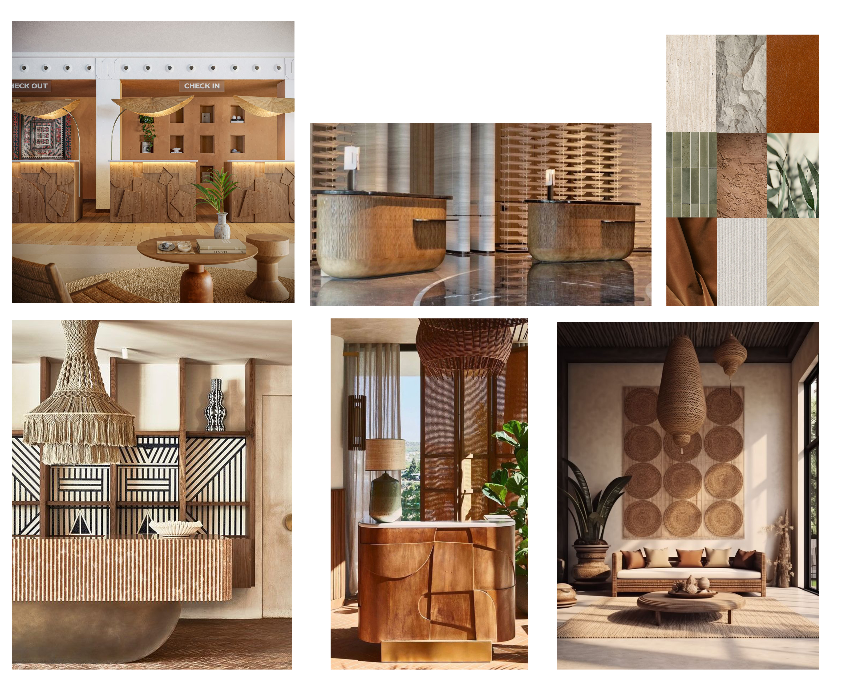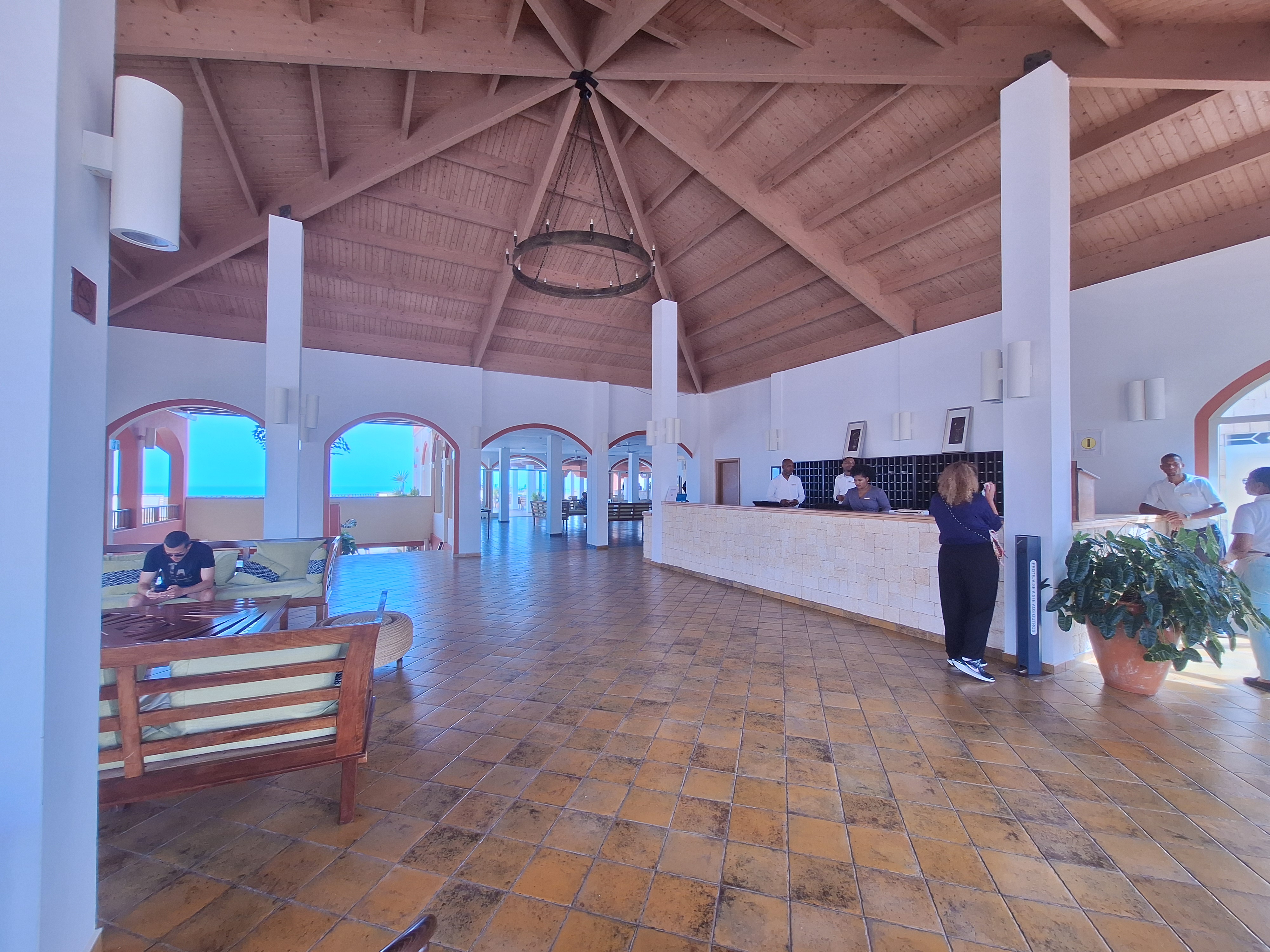 exterior shot render a spacious hotel lobby with a high wooden vaulted ceiling in warm brown tones the walls are white providing a fresh and clean look large arched windows should let in abundant natural light revealing a clear blue sky outside the tiled floor is a rustic mustard yellow with subtle earth tones include a wooden reception desk with white stone facing attended by people in casual relaxed attire the atmosphere is welcoming and serene evoking a sense of calm and relaxation add lush green potted plants for a touch of nature and vibrancy keep the architectural structure of the main building