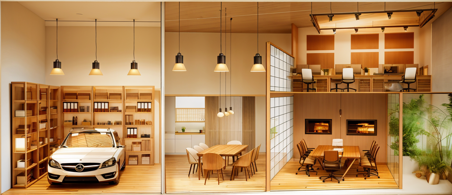there is no glass wall outside outside there are trees from japan there are no timber walls the dining table and chairs is a small round table with chairs there is a lounge seating in the kitchen area