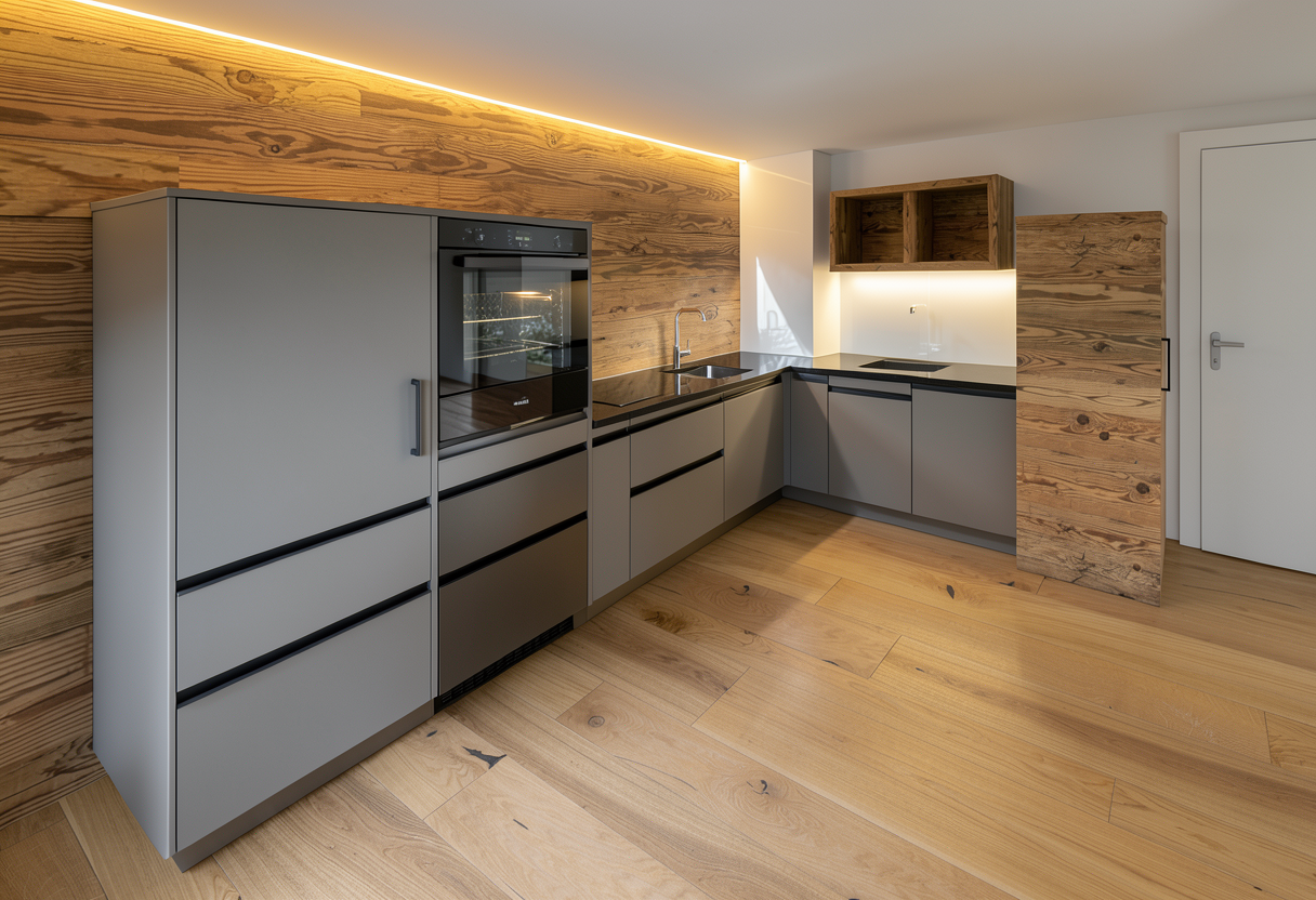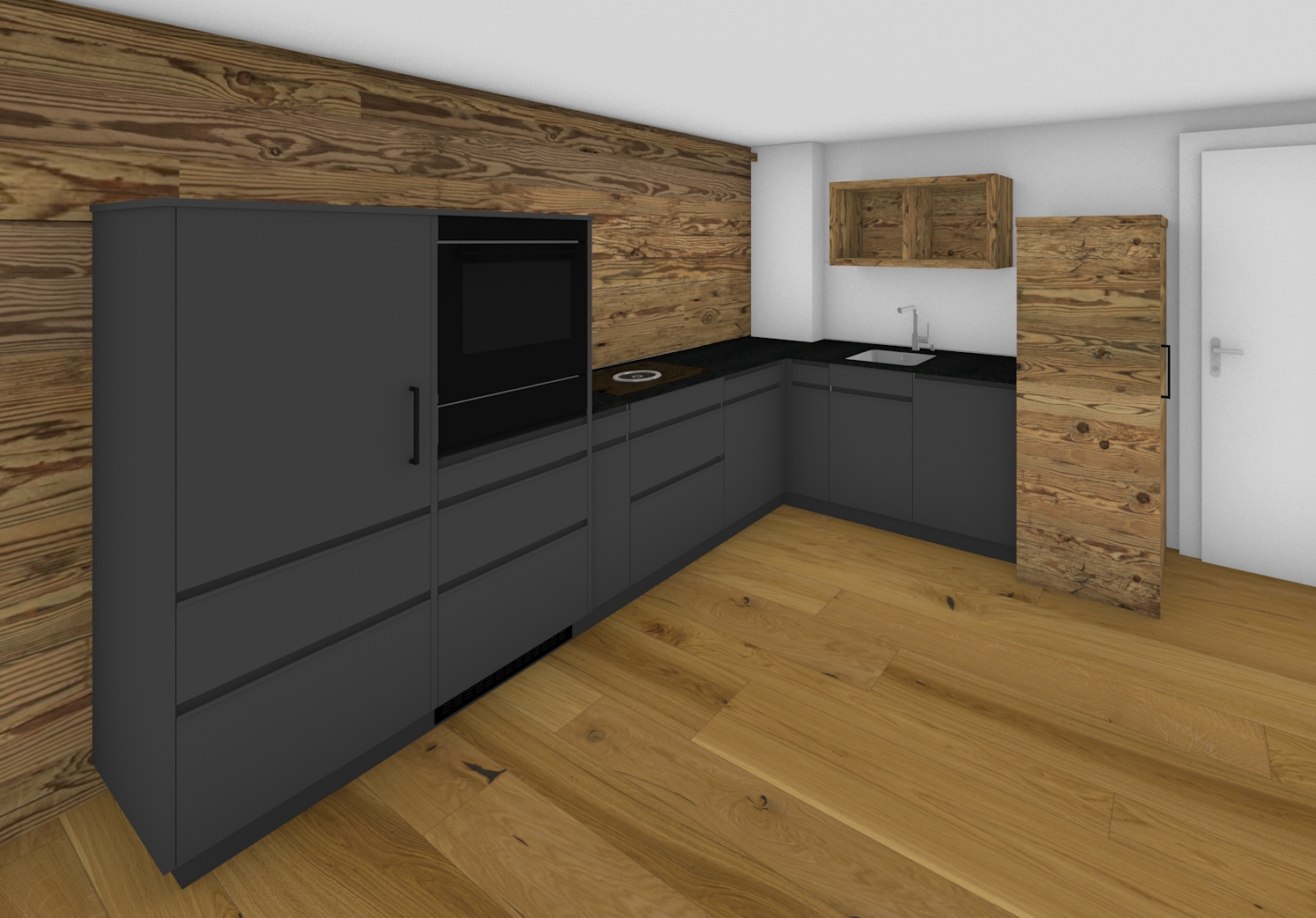 das holz ist originales altholz 4a du findest die oberfl che im internet das waschbecken ist aus edelstahl gl nzend und hat keinen rand die armatur ist aus edelstahl gl nzend das ger t hochschrank ist ein schwarzes backofen von v zug und hat das licht an die arbeitsfl che ist ein schwarzer granit und hat eine matte oberfl che an der holzwand ist ganz oben ber die ganze l nge eine led beleuchtung eingelassen welche die decke indirekt beleuchtet und auch nach unten leuchtet an der decke gibt es keine zus tzliche lampen das kochfeld ist fl chenb ndig in die arbeitsplatte eingelassen das h ngende m bel an der wand hinten hat aussen eine led beleuchtung nach unten im m bel innen hat es kein licht die granitabdeckung ist genau so gross wie auf dem bild es hat keine steckdose in der k che die r ckwand hinter der armatur bis zum mauer vorsprung ist eine weisse glas r ckwand ndere nichts an der anordnung oder einteilung der k che der griff vom backofen ist schwarz ob dem holz m bel an der wand sieht man einen lichtschein vom deckel zur decke hoch gehen die griffleisten sind schwarz ndere nichts an der einteilung der k che