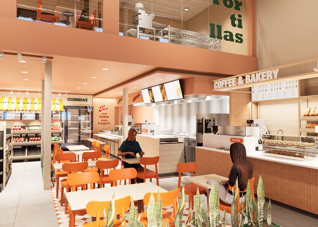 enhance the existing architectural scene with realistic people and product stocking only interior view of a local neighborhood supermarket people additions one employee standing behind the order counter wearing a solid green work apron natural working posture one customer standing at the counter placing an order casual everyday behavior no additional people beyond those described no new furniture objects props or decorations no changes to walls floors ceiling lighting fixtures or materials no stylization no illustration no cinematic effects