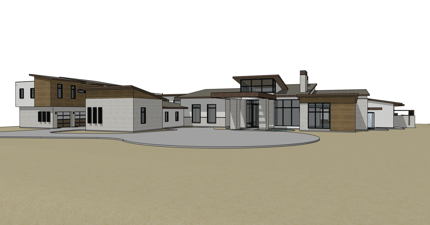render a photorealistic 3d perspective of this house in a poway ca reference the current material style just enhance them bronze standing seam metal roof horizintal cedar wood siding concrete walls keep model geometry the same windows doors roof walls garage door pavement driveway make a lush vegetation that looks native to poway ca do not change the view only enhance the current materials and make the landscape nicer vegetation detailed textures in the wood siding and glass reflections and a vibrant sky with a few clouds and light atmospheric depth render in hyper realistic architectural visualization quality 8k resolution