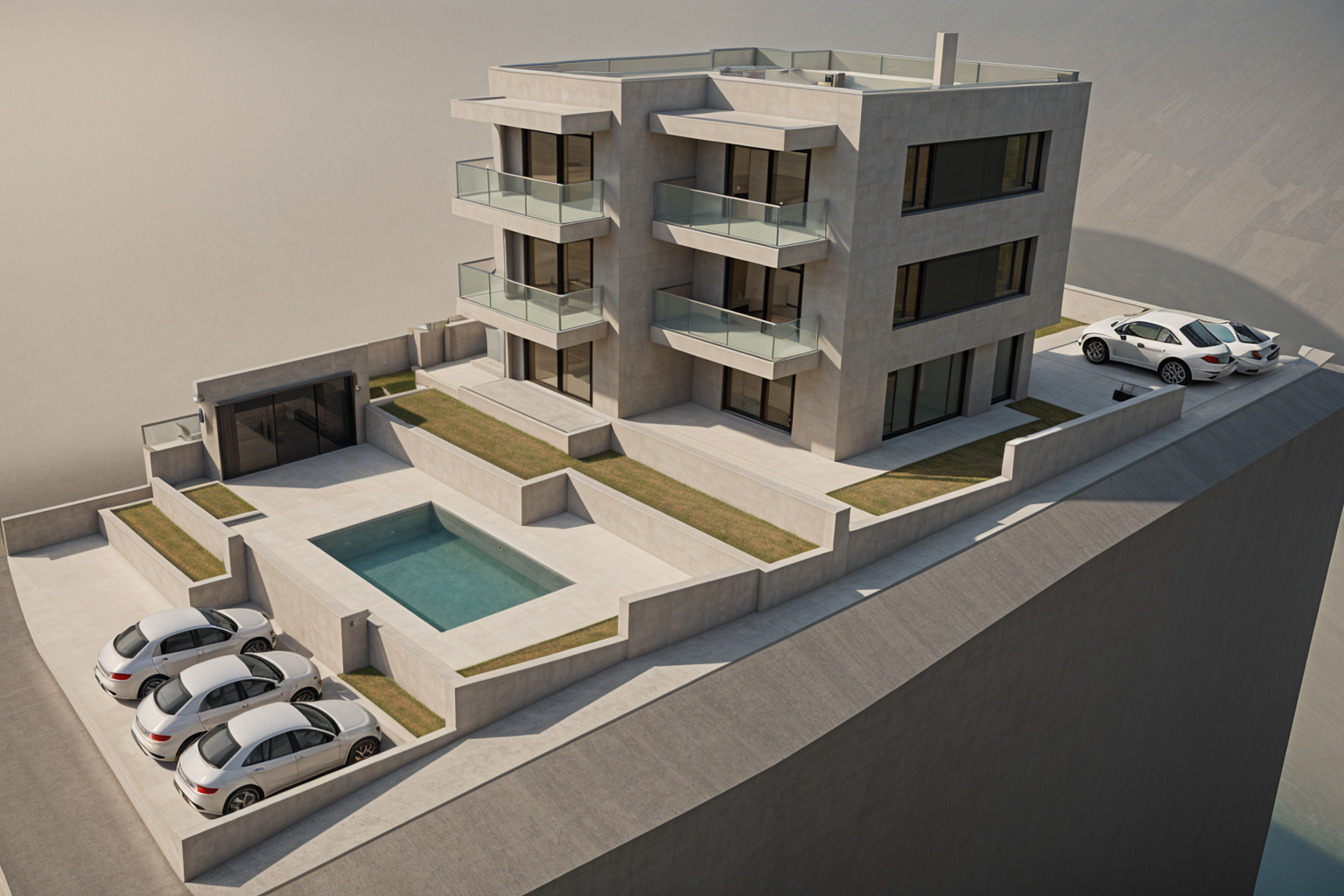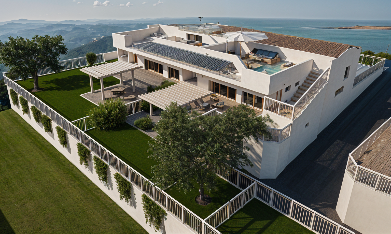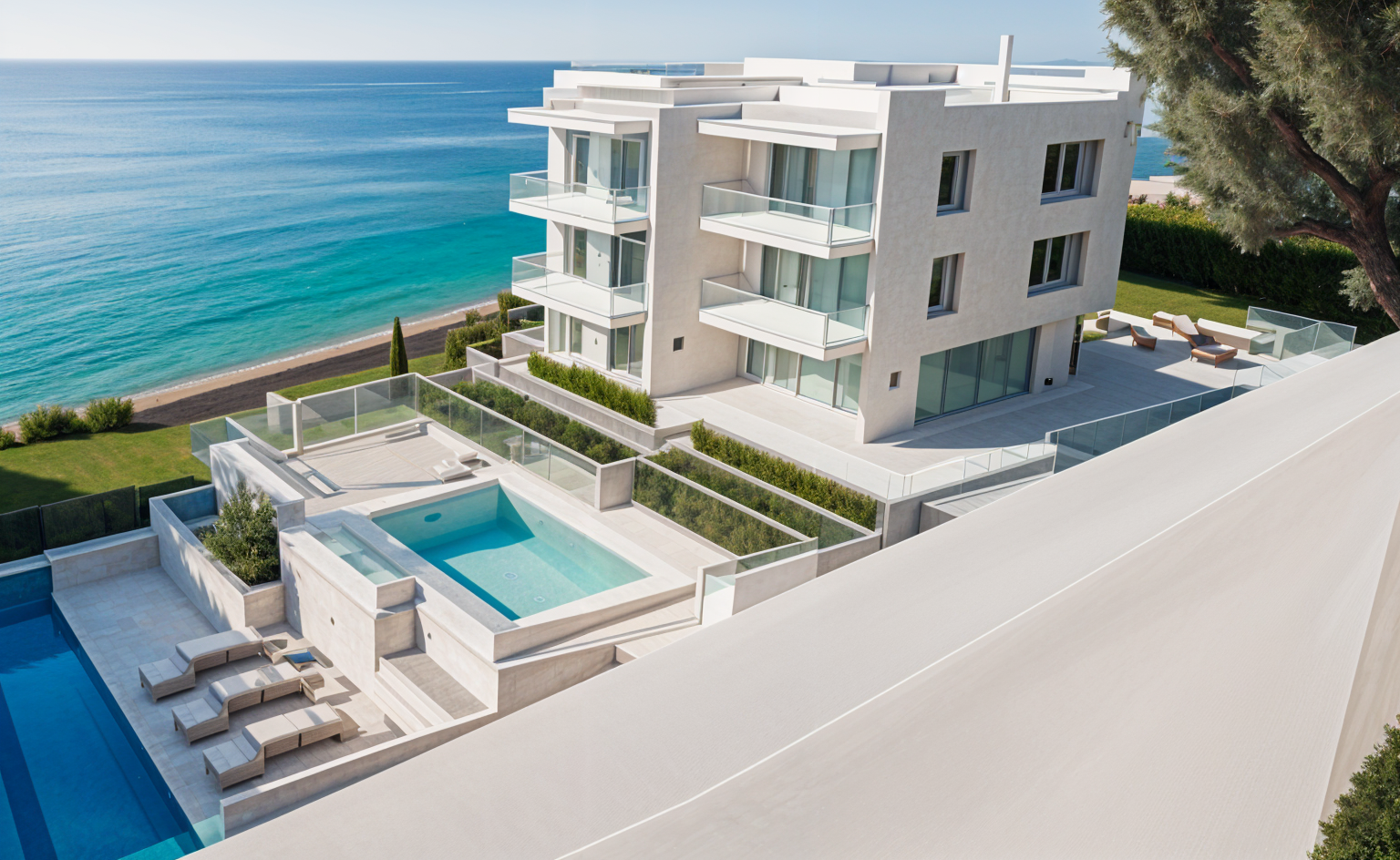 nordic exterior shot medireranean forest interiors in windows grey aluminium railings small olive trees in garden ethimo furniture grey window frames light grey rendered facade architecture