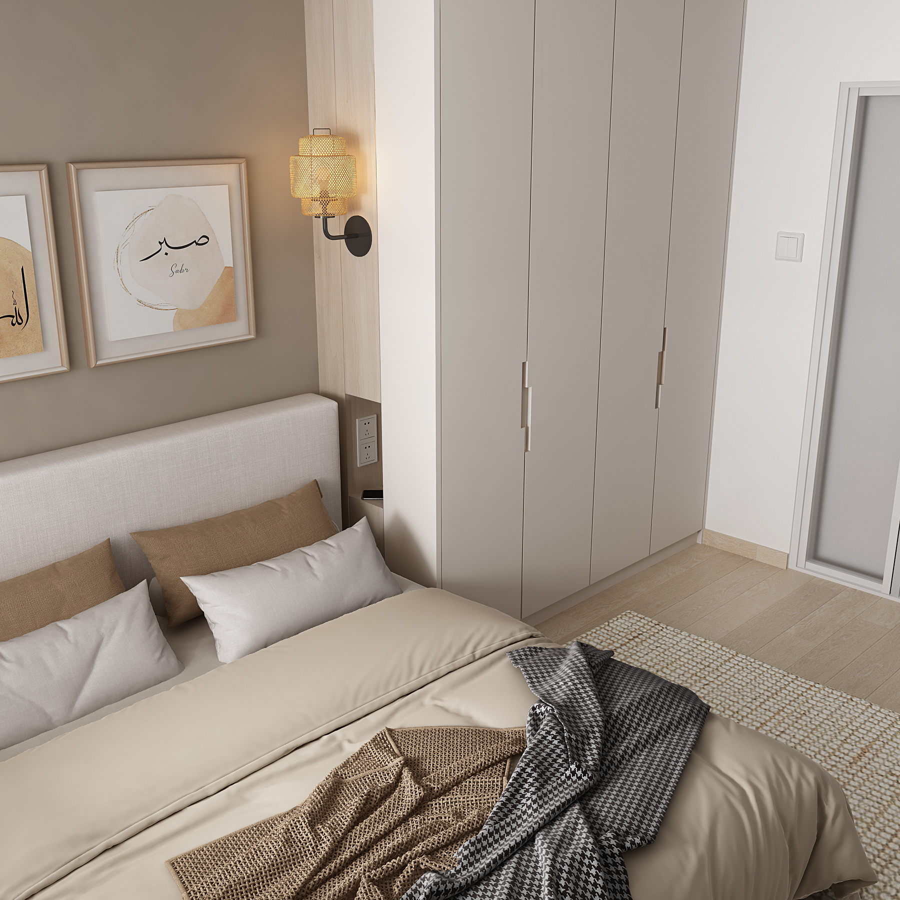 the original image is the authoritative reference follow the drawing exactly preserve all wall positions and room proportions exactly no redesign no change of camera angle no layout modification no change on all geometry realistic materials soft global illumination warm ambient lighting led strip accent lighting sunlight entering from windows realistic shadows ambient occlusion highly detailed furniture clean architectural visualization ultra sharp render minimal background high contrast lighting dramatic shadows ray traced lighting photorealistic rendering ultra detailed textures render in natural daylight and show sunshadow